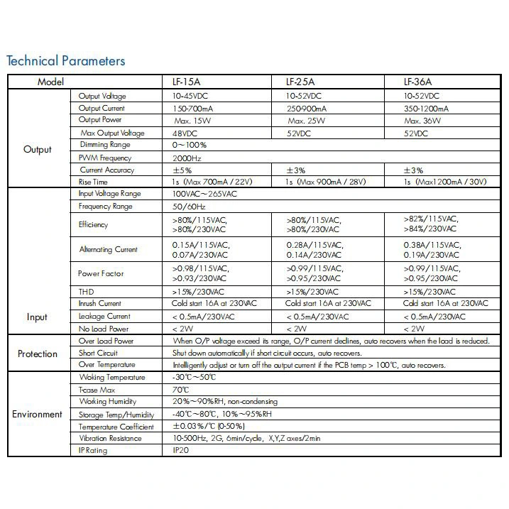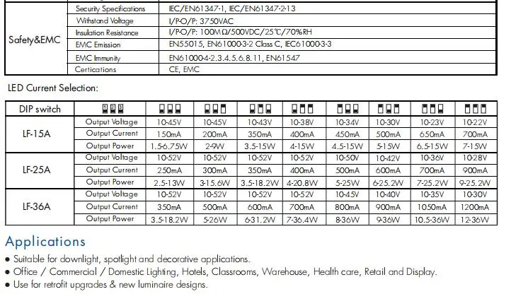 தானியங்கி மின்னழுத்த இணக்கம்: இயக்கி அதன் குறிப்பிட்ட வரம்பிற்குள் (எ.கா., 12-24VDC, 20-40VDC) இணைக்கப்பட்ட LED சுமையின் முன்னோக்கி மின்னழுத்தத் தேவையுடன் பொருந்துமாறு தானாகவே அதன் வெளியீட்டு மின்னழுத்தத்தை சரிசெய்கிறது.