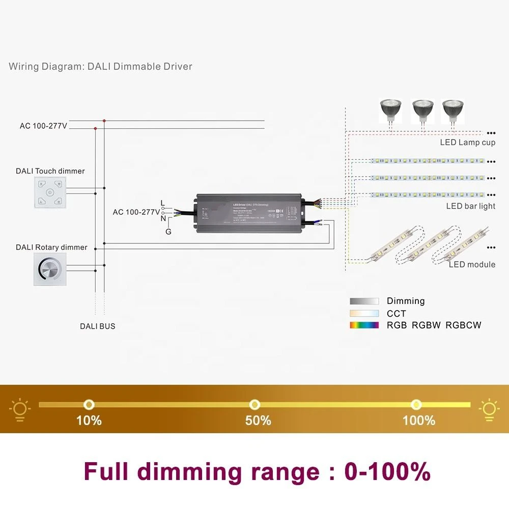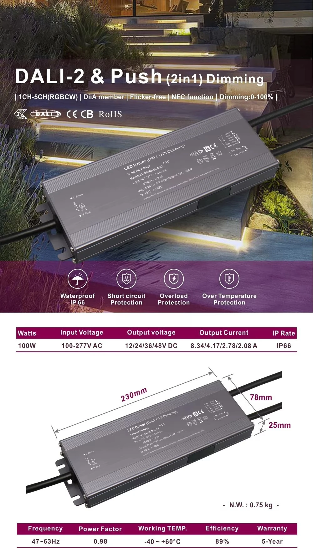Starwell, சீனாவில் ஒரு தொழில்முறை LED இயக்கி உற்பத்தியாளர், எங்கள் இந்த 100W DALI கான்ஸ்டன்ட் வோல்டேஜ் CCT டிமிங் எல்இடி டிரைவர் DALI-2 சான்றிதழைப் பெற்றுள்ளது. இது ஷார்ட் சர்க்யூட், ஓவர்லோட் மற்றும் அதிக வெப்பநிலைக்கு எதிரான அத்தியாவசிய பாதுகாப்புகளை உள்ளடக்கியது, இலவச காற்று வெப்பச்சலனம் மூலம் செயலற்ற குளிர்ச்சியுடன்.
