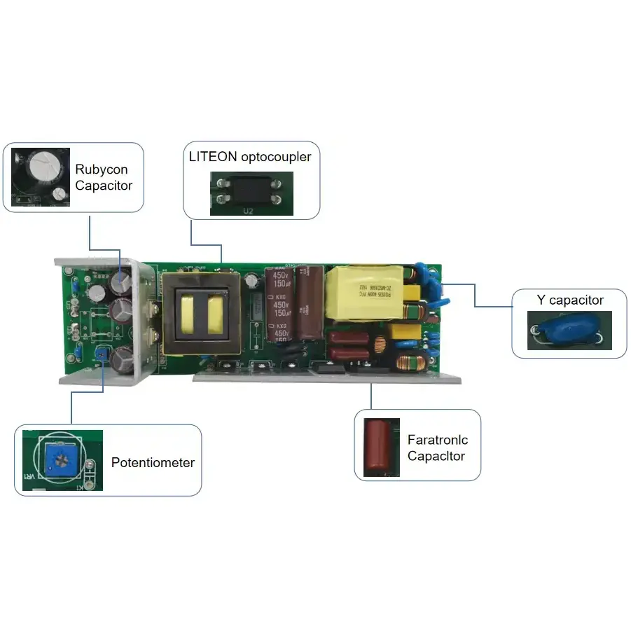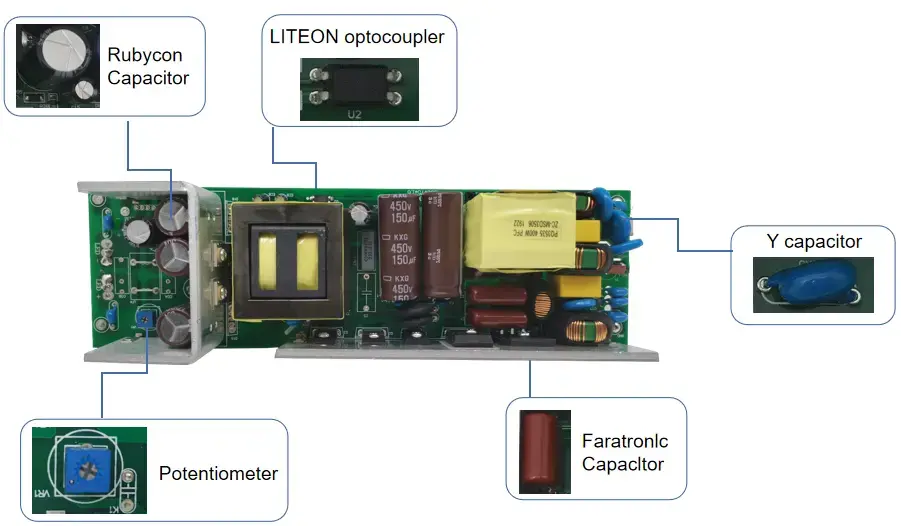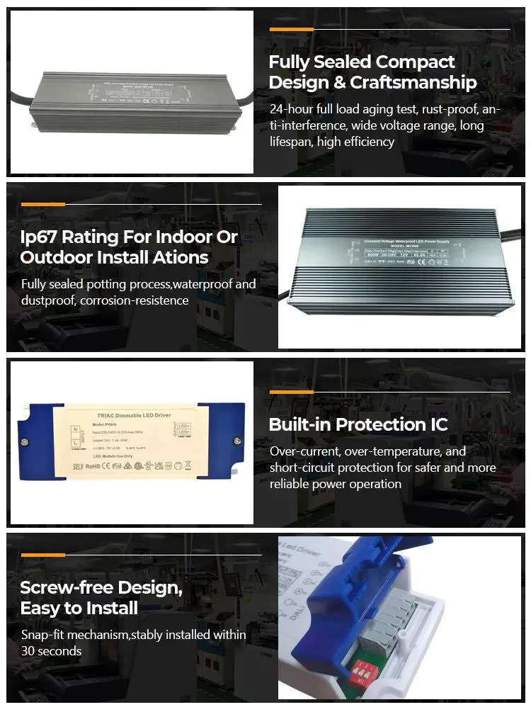 துல்லியமான நிலையான மின்னோட்டம் · நீண்ட காலம் நீடிக்கும் தன்மை: STARWELL நிலையான மின்னோட்டம் டிம்மபிள் LED இயக்கி உயர் துல்லியமான நிலையான மின்னோட்டம் சிப்பைப் பயன்படுத்துகிறது. வெளியீட்டு மின்னோட்டப் பிழை ≤ ± 3%, வெளியீட்டு மின்னோட்டம் 1200mA இல் நிலையானது, மற்றும் ஃப்ளிக்கர் ஆழம் <5%, இதனால் ஒளிரும் மற்றும் ஒளித் தேய்மானம் போன்ற பிரச்சனைகளை நீக்குகிறது. இது LED லைட்டிங் சாதனங்களின் சேவை ஆயுளை 30% க்கும் அதிகமாக நீட்டிக்க முடியும், மேலும் அதன் தொடர்ச்சியான வேலை நேரம் 50,000 மணிநேர பராமரிப்பு செலவை எட்டலாம்.