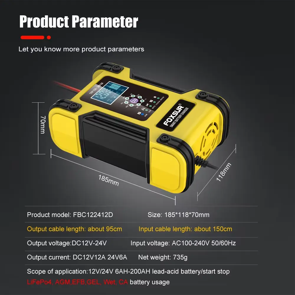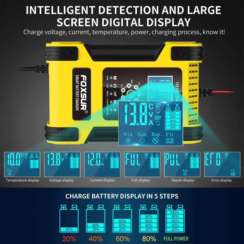 எங்கள் 7-நிலை அறிவார்ந்த சார்ஜிங் அமைப்பு பேட்டரி ஆயுளை நீட்டிக்கவும் செயல்திறனை மேம்படுத்தவும் வடிவமைக்கப்பட்டுள்ளது. பல போட்டியாளர்களைப் போலல்லாமல், இந்த சார்ஜர் ஒவ்வொரு பேட்டரி வகைக்கும் ஏற்றவாறு சார்ஜிங் சுழற்சியை வழங்குகிறது, செயல்திறனையும் நம்பகத்தன்மையையும் அதிகரிக்கிறது.