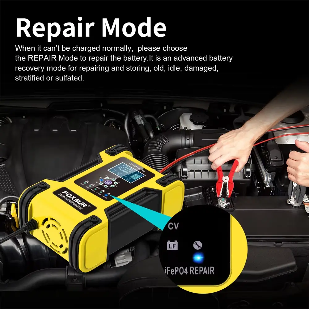 புத்திசாலித்தனமான பழுதுபார்ப்பு செயல்பாடு: உள்ளமைக்கப்பட்ட பல்ஸ் டெசல்பேஷன் பயன்முறையானது சல்பேட்டட் பேட்டரிகளை மீட்டெடுக்கவும், இழந்த திறனை மீட்டெடுக்கவும் உதவுகிறது.