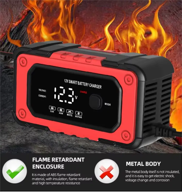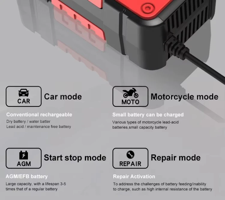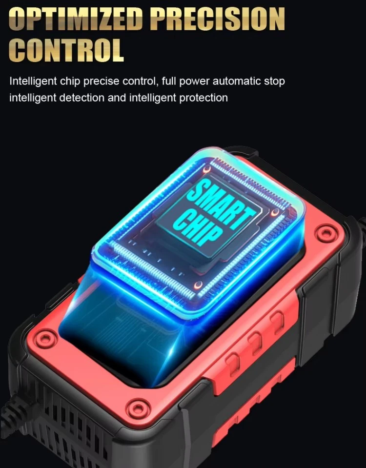 முழு நுண்ணறிவு சார்ஜிங்: நுண்செயலியால் கட்டுப்படுத்தப்படும், பல-நிலை சார்ஜிங் (டிரிக்கிள், நிலையான மின்னோட்டம், நிலையான மின்னழுத்தம், மிதவை மற்றும் துடிப்பு) அதிக சார்ஜ் செய்யாமல் பாதுகாப்பான மற்றும் திறமையான சார்ஜிங்கை உறுதி செய்கிறது.