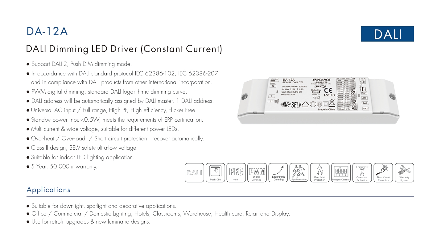 நெகிழ்வான இணக்கத்தன்மை: DALI-2 இணக்கமானது, 64 சுயாதீன முகவரிகள் மற்றும் 16 காட்சி குழுக்களை ஆதரிக்கிறது, BMS மற்றும் மூன்றாம் தரப்பு கட்டுப்படுத்திகளுடன் தடையற்ற ஒருங்கிணைப்பு.