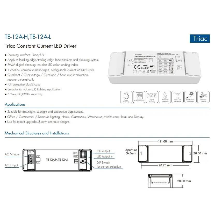 சிறிய அளவு 12W நிலையான தற்போதைய ட்ரையாக் மங்கக்கூடிய LED இயக்கி