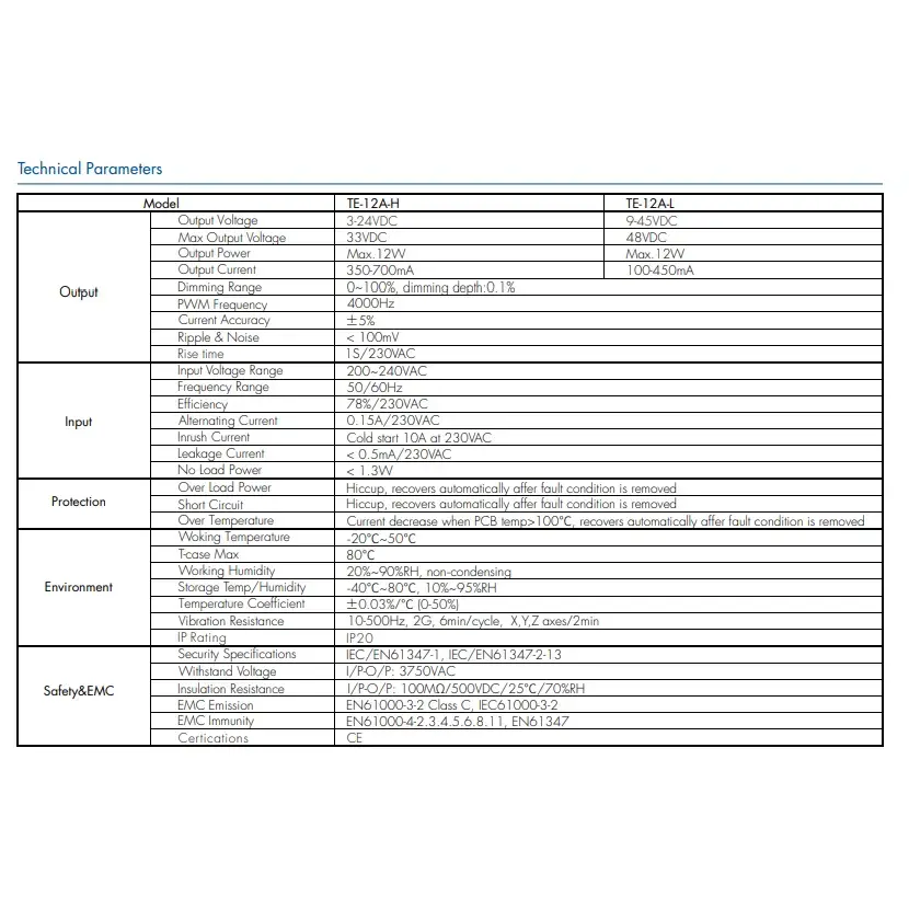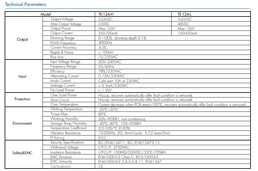 உள்ளீட்டு மின்னழுத்தம்: 200-240VAC 50-60Hz உள்ளீட்டு மின்னோட்டம்:0.15A வெளியீட்டு சக்தி: 12 வாட்ஸ் அதிகபட்சம் வெளியீட்டு மின்னழுத்தம் :9~42V உத்தரவாதம்: 2 ஆண்டுகள் சான்றிதழ்: CE/Rohs