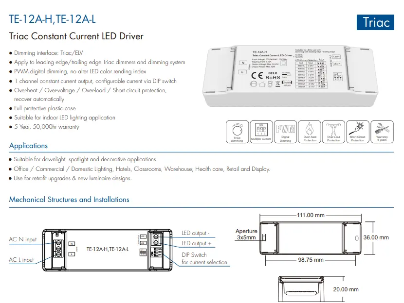 ஸ்டார்வெல் உயர்தர 12W கான்ஸ்டன்ட் கரண்ட் ட்ரையாக் டிம்மிங் லெட் டிரைவர் அதிக மின்னழுத்தம், ஓவர் கரண்ட் மற்றும் ஷார்ட் சர்க்யூட் பாதுகாப்பு செயல்பாடுகளை ஒருங்கிணைக்கிறது, மேலும் பல சர்வதேச ஆற்றல் திறன் மற்றும் பாதுகாப்பு தரத்தை பூர்த்தி செய்யும் உயர் சக்தி காரணி மற்றும் குறைந்த ஹார்மோனிக் டிஸ்டர்ஷன் ஆகியவற்றைக் கொண்டுள்ளது. அதன் கச்சிதமான வடிவமைப்பு, டவுன்லைட்கள், ஸ்பாட்லைட்கள் மற்றும் அலங்கார விளக்குகள் போன்ற பல்வேறு உட்புற லைட்டிங் காட்சிகளை நிறுவுவதை எளிதாக்குகிறது மற்றும் இது ஆற்றல் சேமிப்பு புதுப்பித்தல் மற்றும் ஸ்மார்ட் லைட்டிங் பயன்பாடுகளுக்கு சிறந்த இயக்கி தீர்வாக அமைகிறது. தயாரிப்புஅம்சங்கள்:
