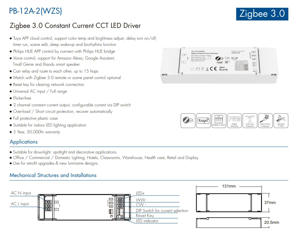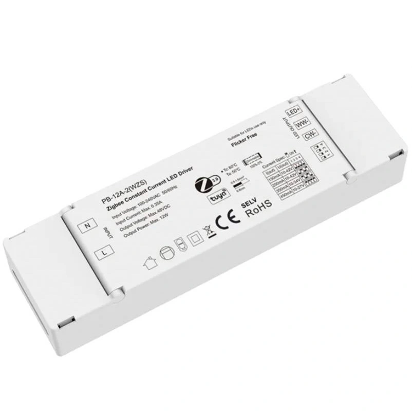 STARWELL தொழிற்சாலையின் CE-சான்றளிக்கப்பட்ட 12W TUYA Zigbee CCT மங்கக்கூடிய LED டிரைவர்கள் நவீன குடியிருப்பு மற்றும் வணிக விளக்கு அமைப்புகளுக்காக வடிவமைக்கப்பட்ட உயர் திறன் கொண்ட ஸ்மார்ட் லைட்டிங் பவர் தீர்வாகும். இது 100~240VAC 50/60Hz பரந்த உள்ளீட்டு மின்னழுத்தத்தை ஆதரிக்கிறது, இது நிலையான உலகளாவிய பயன்பாட்டை செயல்படுத்துகிறது. max.12W இன் மதிப்பிடப்பட்ட வெளியீட்டு சக்தியுடன், TUYA Zigbee வயர்லெஸ் நெறிமுறையின் அடிப்படையில் மென்மையான CCT டிம்மிங் கட்டுப்பாட்டை இந்த இயக்கி உணர்கிறது, பயனர்கள் APP, குரல் உதவியாளர்கள் மற்றும் ஸ்மார்ட் காட்சிகள் மூலம் பிரகாசம் மற்றும் வண்ண வெப்பநிலை இரண்டையும் ரிமோட் மூலம் சரிசெய்ய அனுமதிக்கிறது.