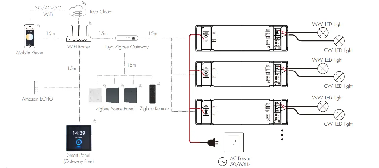 TUYA Zigbee LED டிரைவர் நிலையான வயர்லெஸ் இணைப்புக்கான TUYA Zigbee நெறிமுறையை முழுமையாக ஆதரிக்கிறது, மென்மையான ஃப்ளிக்கர் இல்லாத CCT மற்றும் பிரகாசம் மங்குவதை அடைகிறது. இது APP கட்டுப்பாடு, குரல் கட்டுப்பாடு, குழு கட்டுப்பாடு மற்றும் காட்சி முறை ஆகியவற்றை ஆதரிக்கிறது, இது ஸ்மார்ட் லைட்டிங் அமைப்புகளுக்கு சிறந்த வசதியைக் கொண்டுவருகிறது.