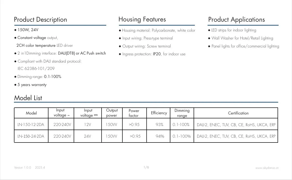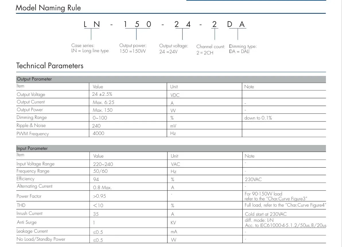 ஸ்டார்வெல் தொழிற்சாலையின் ஹாட் சேல் 150W 24V DALI CCT கான்ஸ்டன்ட் வோல்டேஜ் எல்இடி டிரைவர் சுயாதீனமான DALI CCT இரட்டை வண்ண வெப்பநிலை சரிசெய்தலை ஆதரிக்கிறது, இது பல்வேறு லைட்டிங் தேவைகளை பூர்த்தி செய்ய பிரகாசம் மற்றும் வண்ண வெப்பநிலையின் துல்லியமான கட்டுப்பாட்டை செயல்படுத்துகிறது. தயாரிப்பு 91% உயர் செயல்திறன், ஒரு சக்தி காரணி (PF) > 0.95, குறைந்த ஹார்மோனிக் டிஸ்டர்ஷன் (THD) <10%, மற்றும் மிகக் குறைந்த காத்திருப்பு மின் நுகர்வு (≤ 0.5W), CE-Erp ஆற்றல் திறன் தரநிலைகளை பூர்த்தி செய்கிறது.