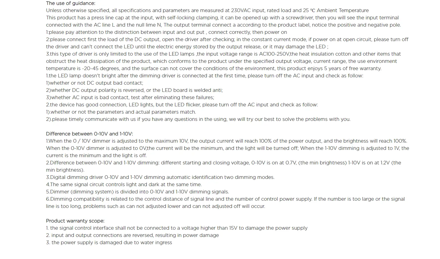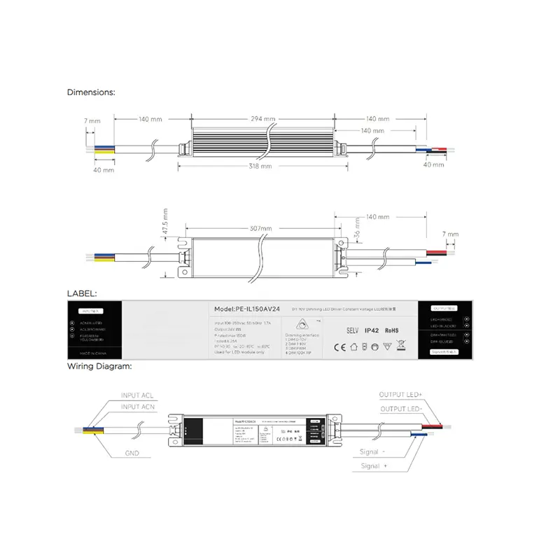 நிலையான 0-10V டிம்மிங் இடைமுகத்துடன் பொருத்தப்பட்டுள்ளது, இது 1% முதல் 100% வரை மென்மையான பிரகாச சரிசெய்தலை ஆதரிக்கிறது, இது சந்தையில் உள்ள பெரும்பாலான முன்னணி மங்கல்களுடன் இணக்கமானது. 95% வரை அதிக ஆற்றல் திறன் மற்றும் 100-277V பரந்த ஏசி உள்ளீடு வரம்பை பெருமையாகக் கொண்டுள்ளது, இது உலகளாவிய மின்னழுத்த தரநிலைகளுக்கு சிரமமின்றி மாற்றியமைக்கிறது, இது சர்வதேச திட்டங்களுக்கு ஏற்றது.