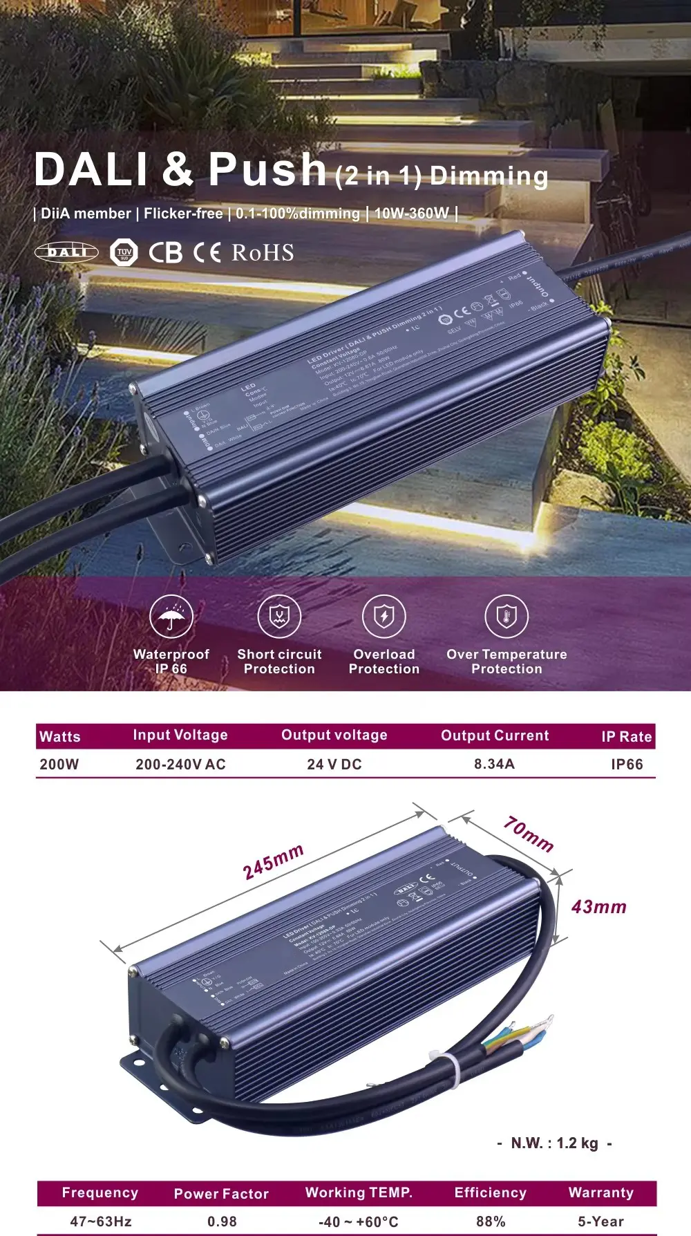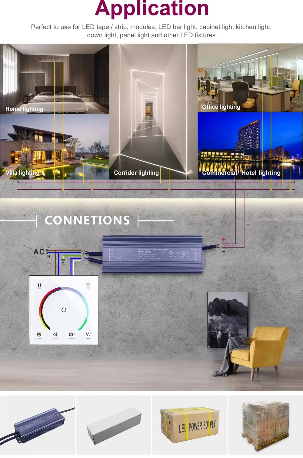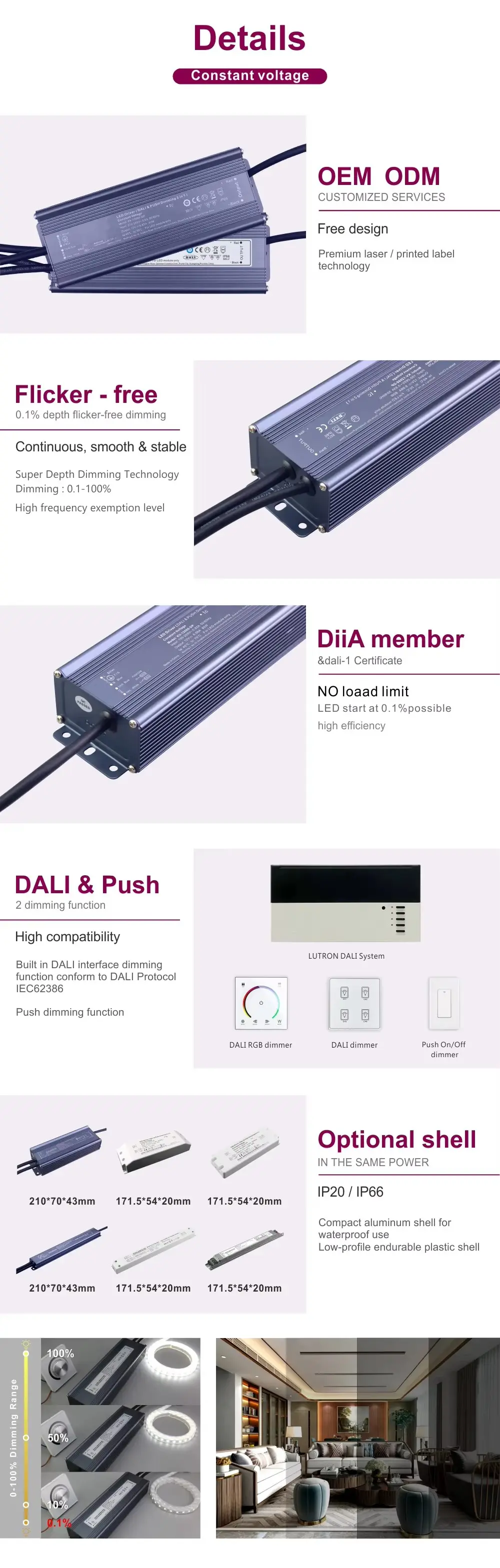 குறைபாடற்ற செயல்திறனுக்காக வடிவமைக்கப்பட்டது, இது உண்மையான ஃப்ளிக்கர்-இல்லாத செயல்பாடு மற்றும் அதி-மென்மையான 0.1% முதல் 100% வரை மங்கலான வரம்பைக் கொண்டுள்ளது, இது சரியான ஒளி தரம் மற்றும் சூழ்நிலை உருவாக்கத்தை செயல்படுத்துகிறது. 12V அல்லது 24VDC வெளியீட்டுடன் 10W முதல் 360W வரையிலான பரந்த ஆற்றல் வரம்பில் கிடைக்கிறது, இது நிலையான மின்னழுத்த LED பட்டைகள் மற்றும் தொகுதிகள் ஒரு பரந்த வரிசைக்கு சிறந்த, எதிர்கால-ஆதார ஆற்றல் தீர்வாகும்.