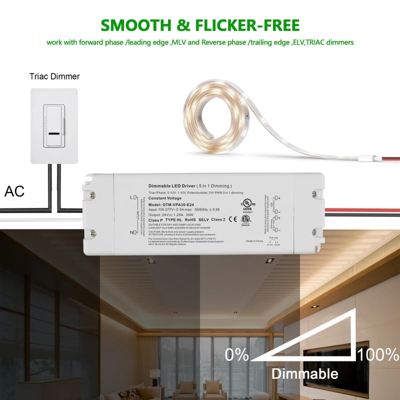 1. துல்லியமான 0-10V டிம்மிங்: STARWELL 0-10V டிம்மிங் லெட் டிரைவர் 0% முதல் 100% வரை பிரகாச மங்கலை ஆதரிக்கிறது, ≤ 1% மங்கலான தெளிவுத்திறனுடன், இது பல்வேறு ஒளி காட்சித் தேவைகளுக்கு ஏற்ப மாற்றியமைக்க முடியும்.