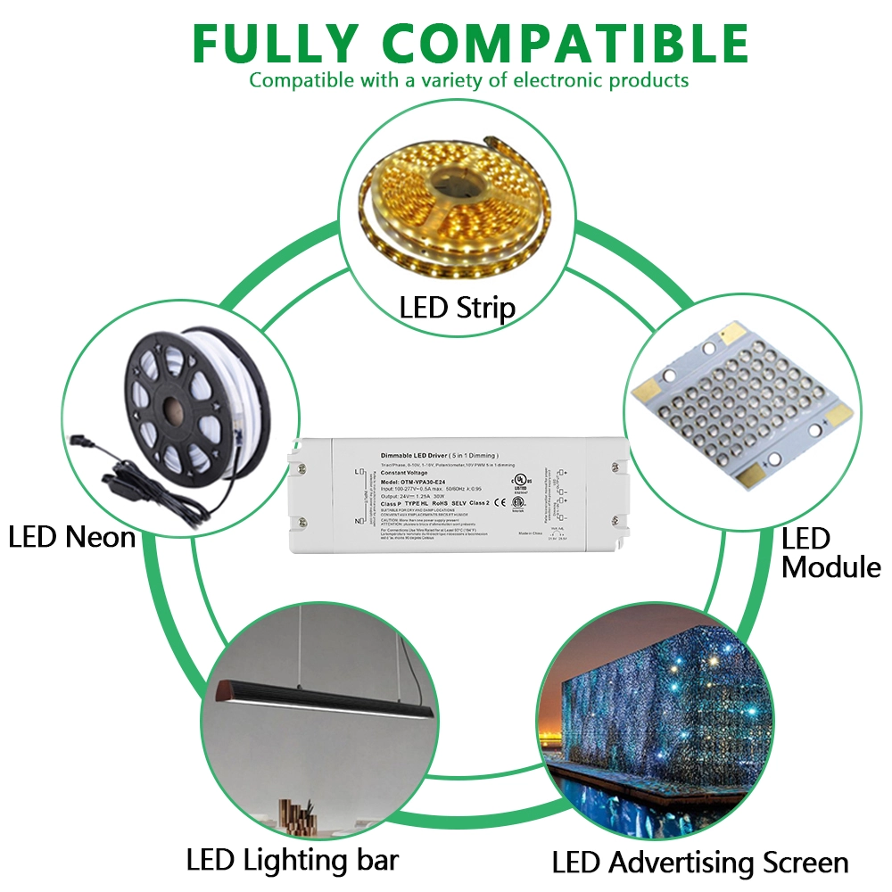 STARWELL தொழிற்சாலையின் கம்பீரமான 24V 30W 0-10V நிலையான மின்னழுத்த மங்கலான LED இயக்கி 30W வரை அதிகபட்ச வெளியீட்டு சக்தியை வழங்க முடியும் மற்றும் குறிப்பாக 0 முதல் 10V வரை தடையற்ற மங்கலான கட்டுப்பாட்டை அடைய வடிவமைக்கப்பட்டுள்ளது. இது ≤ 120mVp-p இன் சிற்றலை குணகத்துடன் நிலையான மின்னழுத்த வெளியீட்டைக் கொண்டுள்ளது, இது LED சாதனங்களின் ஃப்ளிக்கர்-ஃப்ரீ லைட்டிங் செயல்திறனை உறுதி செய்கிறது. அதன் உள்ளீட்டு மின்னழுத்த வரம்பு அகலமானது (100-240V AC, 50/60Hz), 88% வரை மாற்றும் திறனுடன், ஆற்றல் சேமிப்பு செயல்பாட்டை செயல்படுத்துகிறது. இது உலகளாவிய மின்னழுத்த தரநிலைகளுடன் இணங்குகிறது. இந்த 0-10V LED இயக்கி பல்வேறு உட்புற மற்றும் வெளிப்புற விளக்கு பயன்பாடுகளில் நம்பகமான மற்றும் பாதுகாப்பான பயன்பாட்டை உறுதிசெய்ய பல்வேறு பாதுகாப்பு செயல்பாடுகளுடன் பொருத்தப்பட்டுள்ளது.