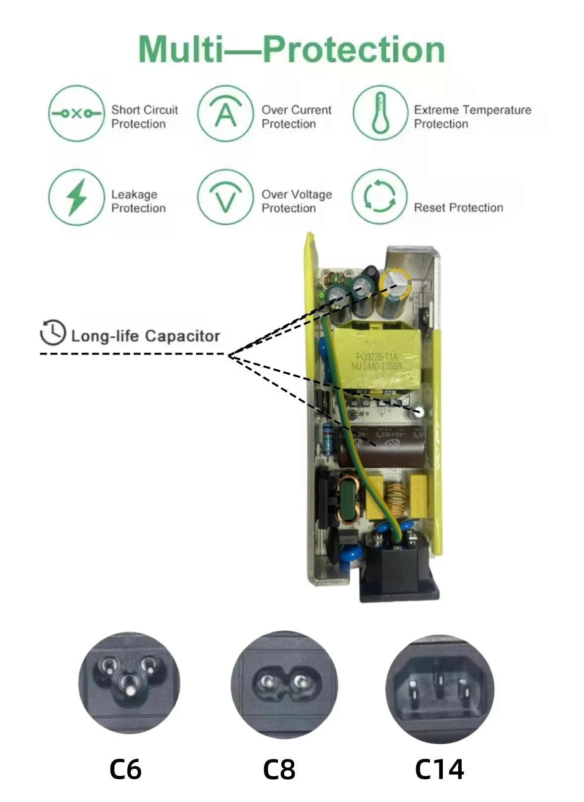 விரிவான பாதுகாப்புப் பாதுகாப்புகள்: ஓவர்-கரண்ட் பாதுகாப்பு (OCP), ஓவர்-வோல்டேஜ் பாதுகாப்பு (OVP), மற்றும் ஷார்ட் சர்க்யூட் பாதுகாப்பு (SCP) உள்ளிட்ட ஒருங்கிணைந்த பாதுகாப்புகள் அடாப்டர் மற்றும் உங்கள் மதிப்புமிக்க உபகரணங்கள் இரண்டிற்கும் சேதத்தைத் தடுக்கின்றன.