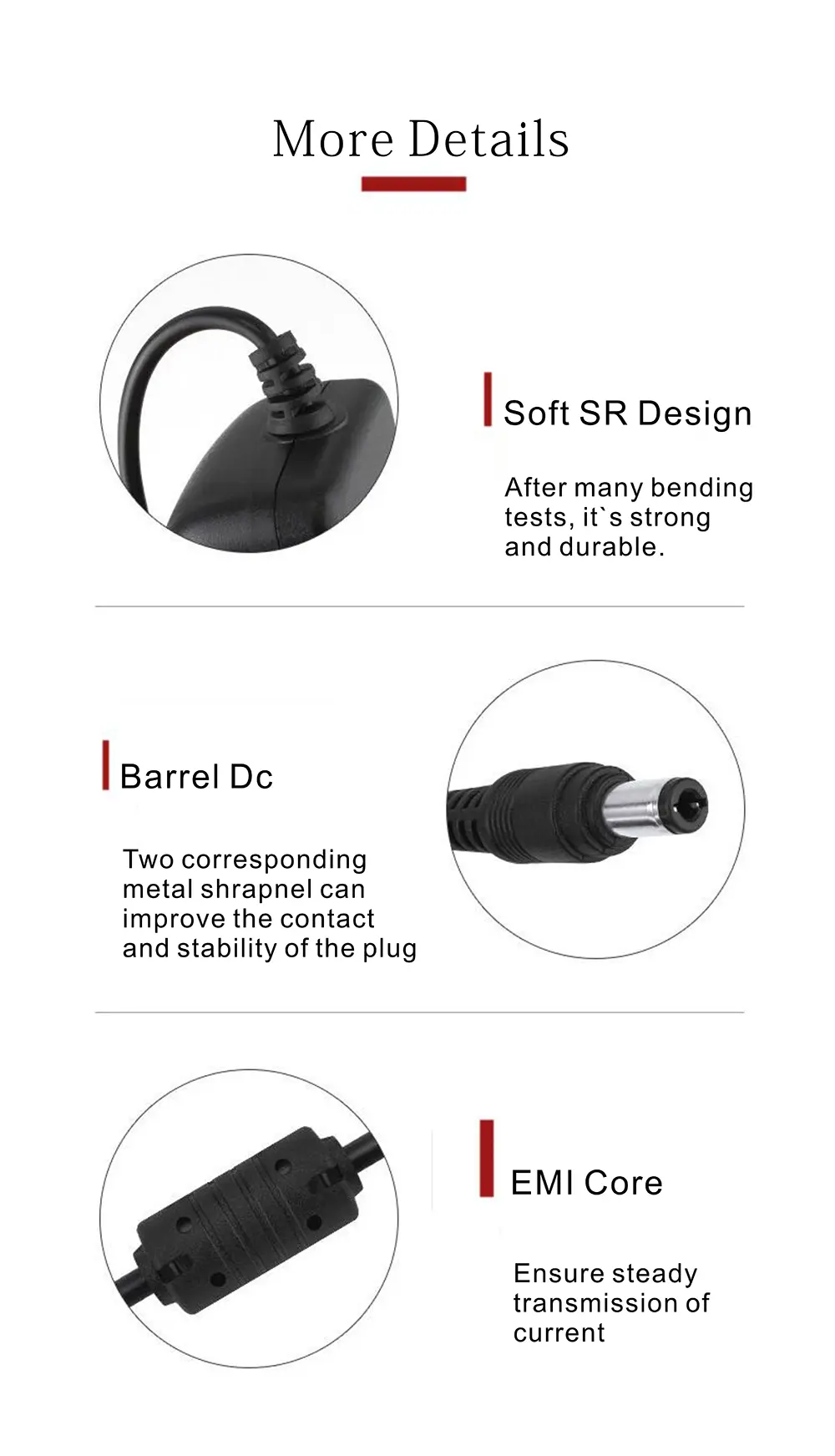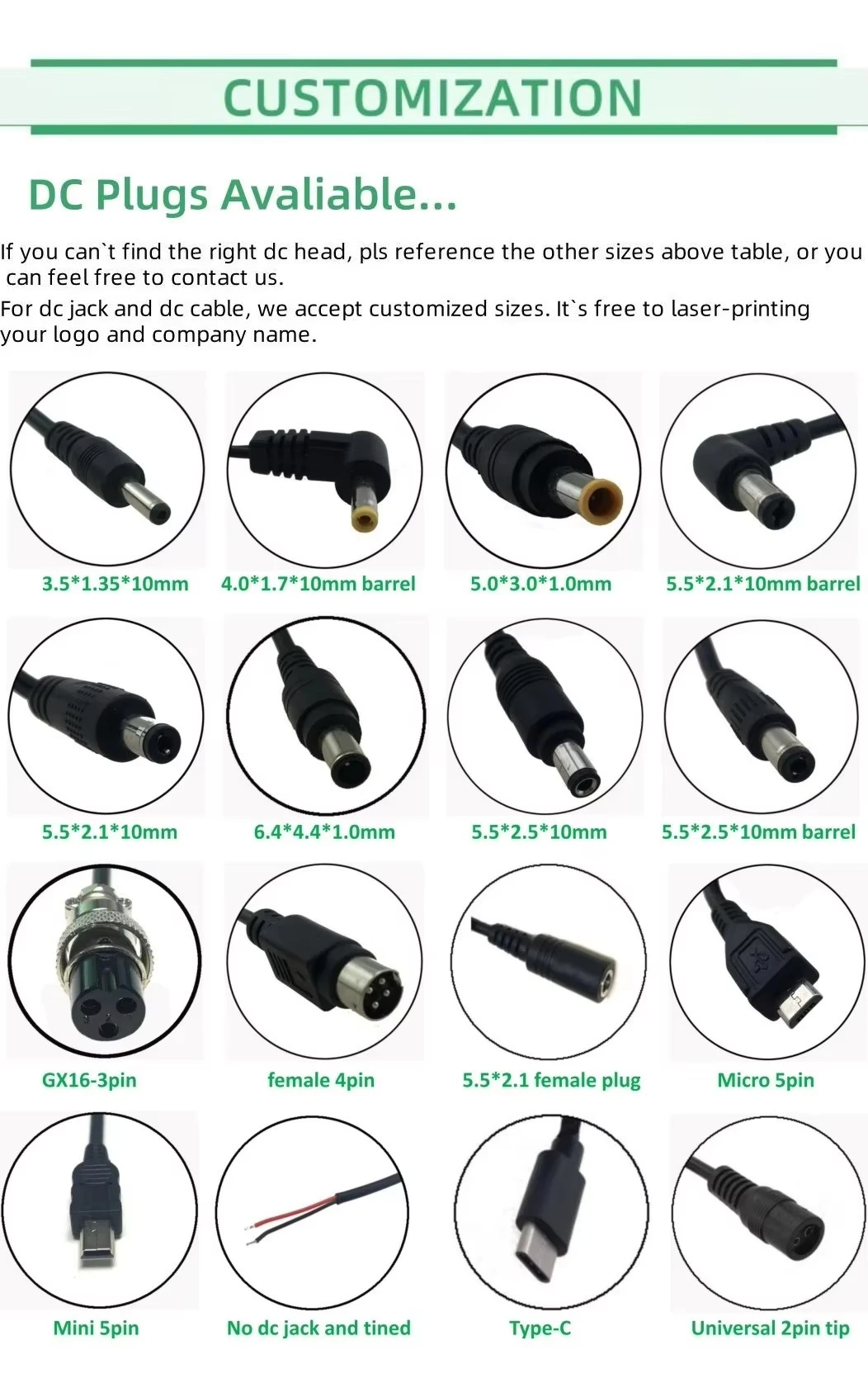 3. கனெக்டர் ஃபிட்: பிளக்கின் அளவு (எ.கா., 5.5 மிமீ x 2.1 மிமீ) மற்றும் துருவமுனைப்பு (பெரும்பாலும் சென்டர்-பாசிட்டிவ்) உங்கள் சாதனத்தின் டிசி ஜாக்குடன் பொருந்துவதை உறுதிப்படுத்தவும். பொருத்தமின்மை சேதத்தை ஏற்படுத்தும்.