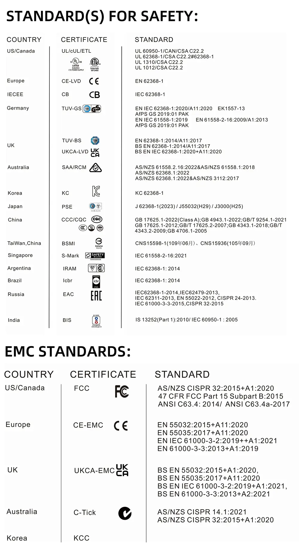 உங்கள் பாதுகாப்பு மிக முக்கியமானது. இந்த அடாப்டர் கடுமையான சர்வதேச தரத்தை பூர்த்தி செய்யும் வகையில் வடிவமைக்கப்பட்டு தயாரிக்கப்பட்டது, நம்பகமான செயல்திறனை மட்டுமல்ல, மன அமைதியையும் உறுதி செய்கிறது. இது ETL CE FCC TUV GS CB PSE KC KCC BIS SAA RCM c-டிக் CCC UKCA UL cUL RoHS உடன் இணங்குகிறது, இது பாதுகாப்பு, சுகாதாரம் மற்றும் சுற்றுச்சூழல் பாதுகாப்பைக் கட்டுப்படுத்துகிறது.