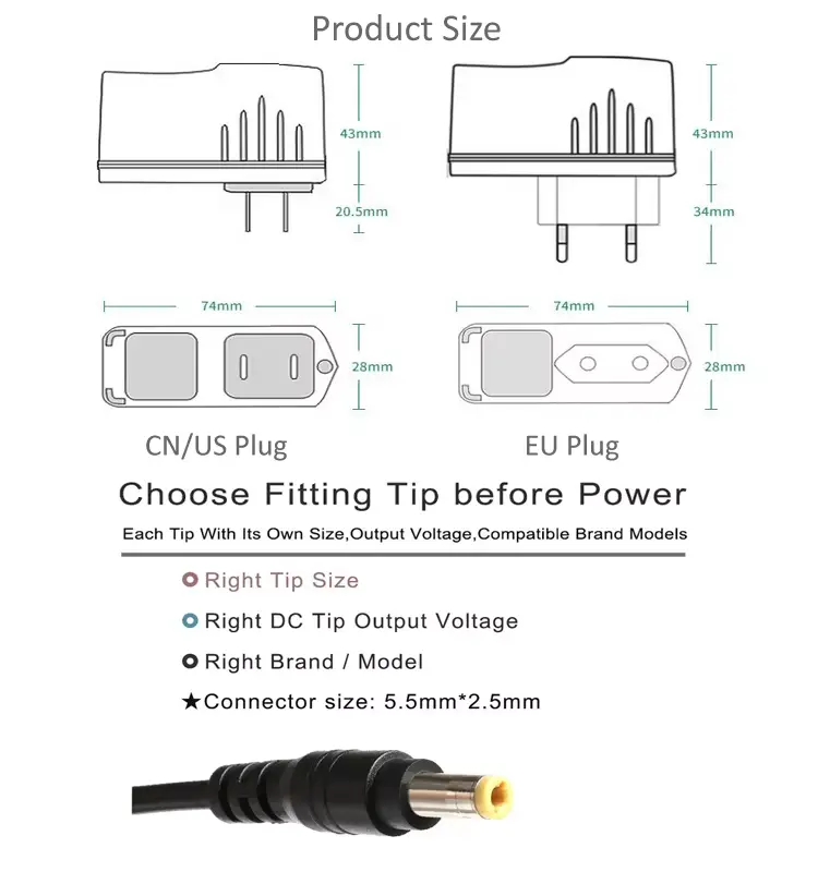 AC பிளக்: US/EU/AU/UK/CN/JP பிளக்குகள் ஒன்றுக்கொன்று மாறக்கூடியவை