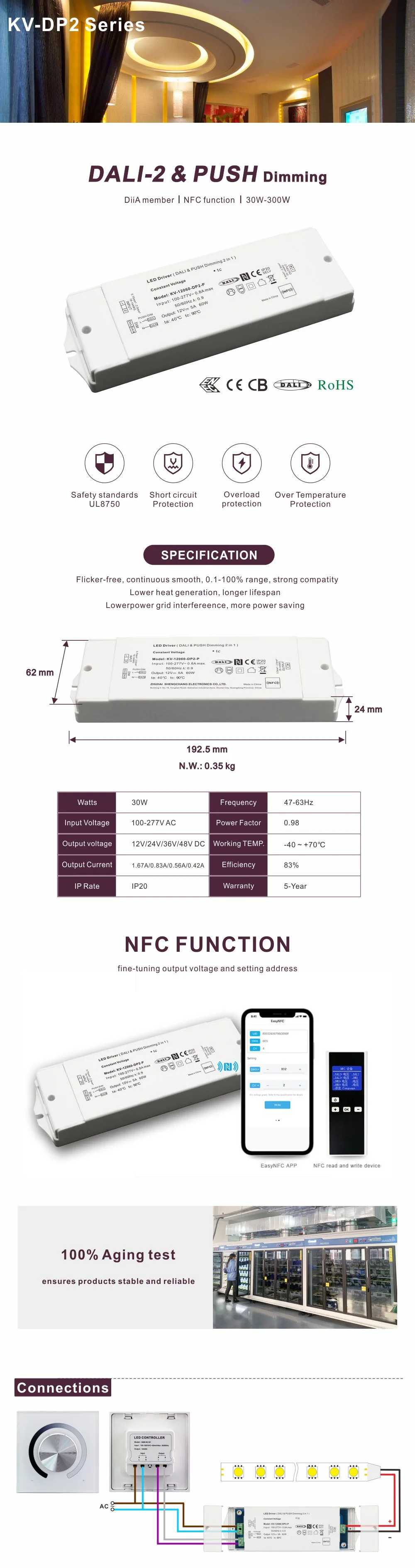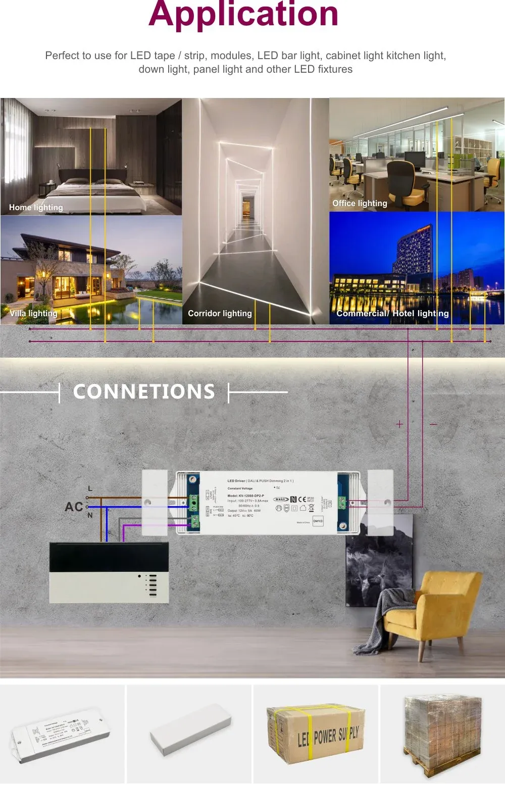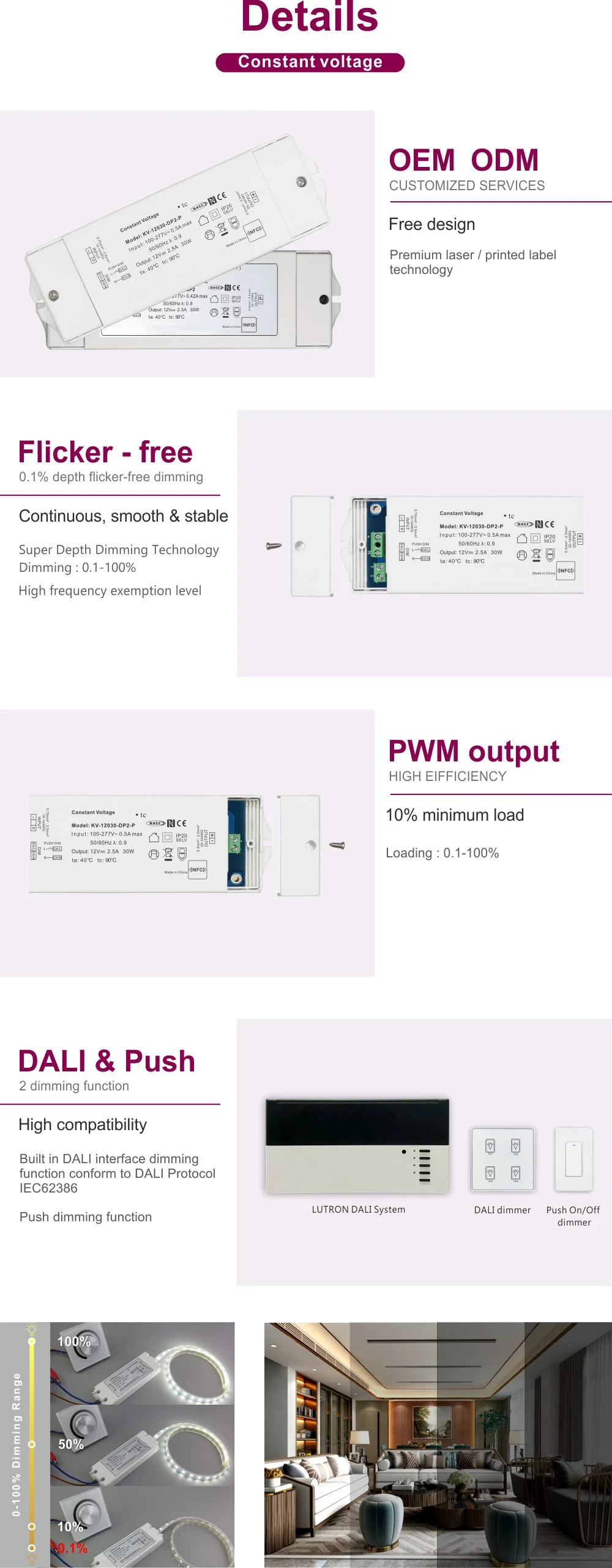 அதன் சக்திவாய்ந்த DALI செயல்பாட்டிற்கு கூடுதலாக, இந்த இயக்கி ஒரு சிறந்த மங்கலான அனுபவத்தை வழங்குகிறது. இது ஒரு மென்மையான NFC டிம்மிங் ஸ்மூத் நோ ஃப்ளிக்கர் விளைவை அடைகிறது, குறைந்த பிரகாச நிலைகளில் கூட தெரியும் மினுமினுப்பு மற்றும் நடுக்கத்தை முற்றிலுமாக நீக்குகிறது, பார்வையை திறம்பட பாதுகாக்கிறது மற்றும் வசதியான மற்றும் ஆரோக்கியமான ஒளி சூழலை உருவாக்குகிறது. அதன் பரந்த AC உள்ளீட்டு மின்னழுத்த வரம்பு (100-265V உள்ளீடு) வடிவமைப்பு, உலகளாவிய மின் கட்டங்களில் உள்ள மின்னழுத்த ஏற்ற இறக்கங்களுக்கு ஏற்றவாறு பல்வேறு பகுதிகளில் நிலையான செயல்பாட்டை உறுதி செய்கிறது.
