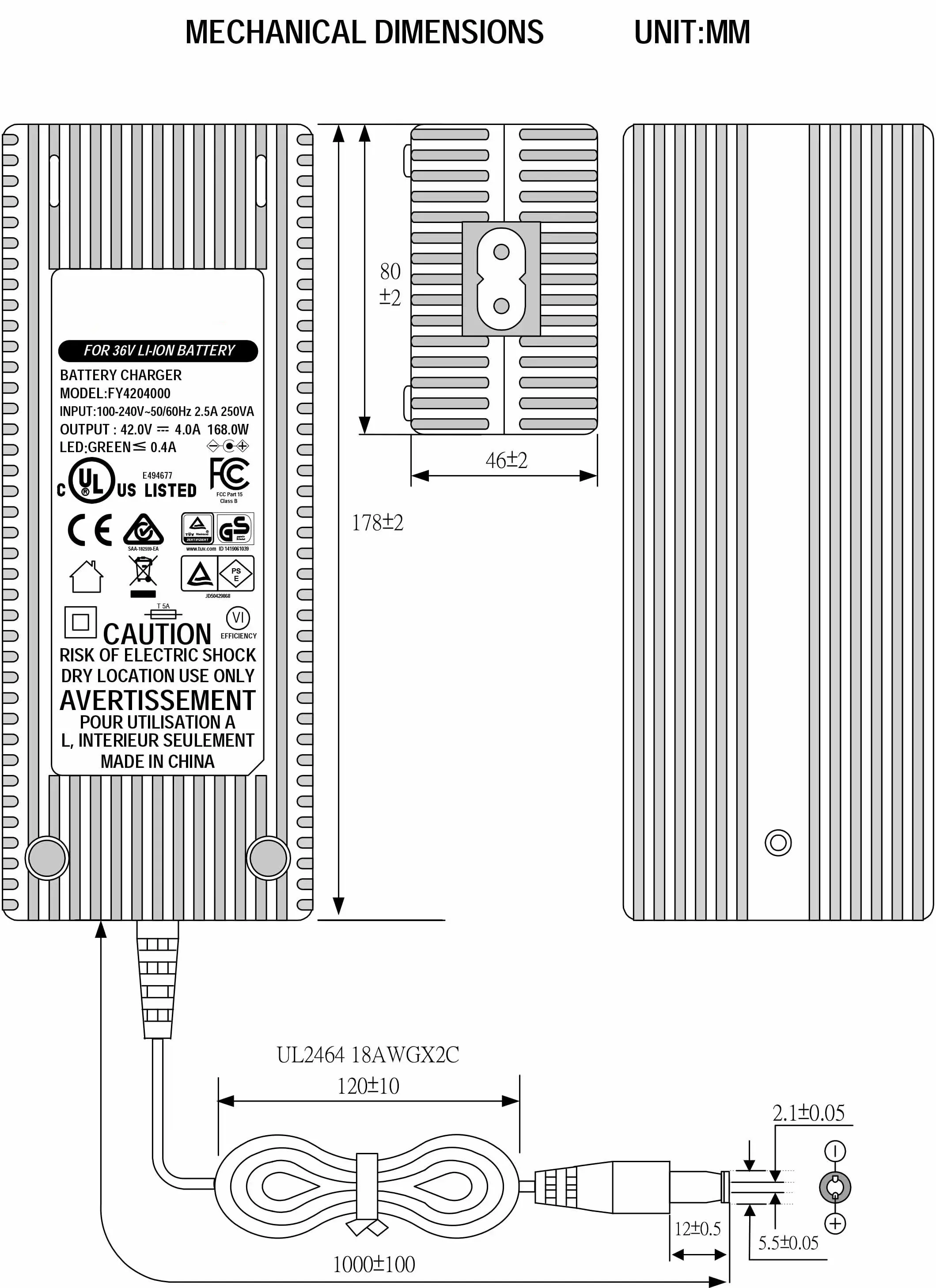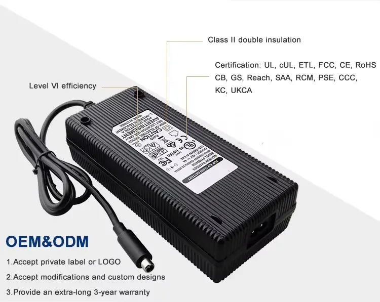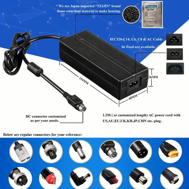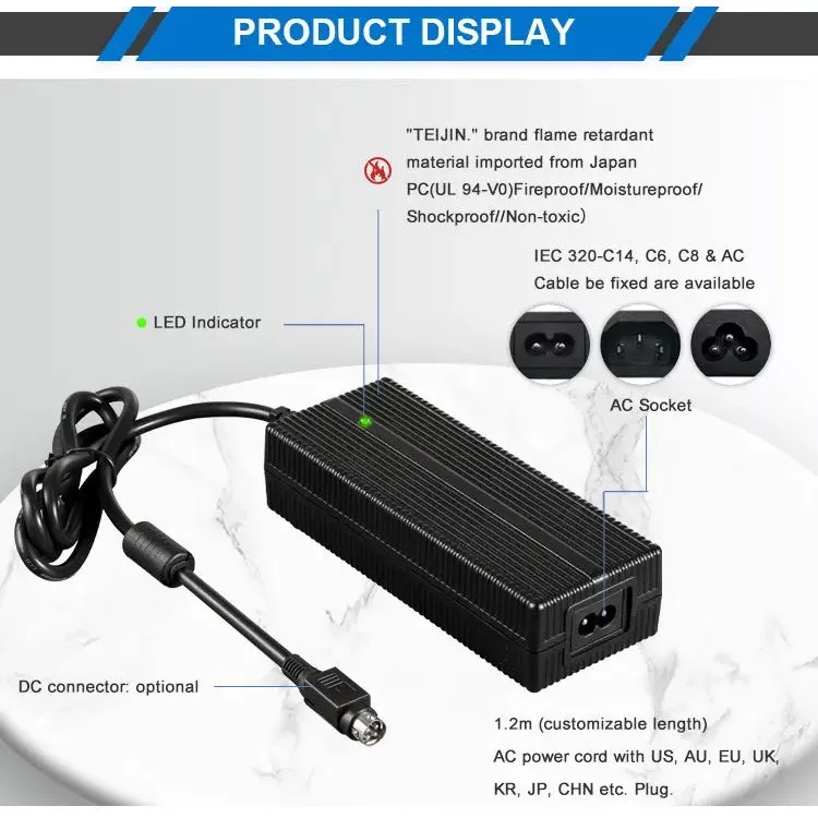 உலகளாவிய இணக்கத்தன்மை மற்றும் நெகிழ்வான வடிவமைப்பு: 100–240VAC, 50/60Hz என்ற உலகளாவிய ஏசி உள்ளீட்டு வரம்புடன் கட்டமைக்கப்பட்டுள்ளது, இந்த சார்ஜர் உலகளாவிய பயன்பாட்டை ஆதரிக்கிறது. இது பல ஏசி இன்லெட் விருப்பங்களை வழங்குகிறது (IEC320-C14, C6, C8) மேலும் US, AU, EU, UK, KR, JP, CHN மற்றும் பிற பிராந்திய பிளக்குகளுடன் தனிப்பயனாக்கக்கூடிய 1.2M பவர் கார்டுடன் வருகிறது. பல்வேறு இயக்க நிலைமைகளின் கீழ் ஆயுள் மற்றும் பாதுகாப்பை உறுதி செய்யும் பிசி தீயில்லாத பொருட்களால் இந்த வீடு கட்டப்பட்டுள்ளது.