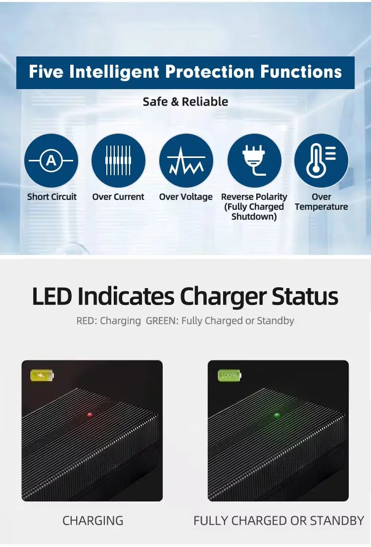 புத்திசாலித்தனமான மூன்று-நிலை சார்ஜிங் (CC/CV/Trickle) பொருத்தப்பட்டுள்ளது, இது அதிக சார்ஜ், அதிக வெப்பம் மற்றும் ஷார்ட் சர்க்யூட்டுகளைத் தடுப்பதன் மூலம் சிறந்த பேட்டரி ஆரோக்கியத்தை உறுதி செய்கிறது. நீடித்த அலுமினிய அலாய் ஹவுசிங் பாதுகாப்பான, நீண்ட கால பயன்பாட்டிற்கு சிறந்த வெப்பச் சிதறலை வழங்குகிறது. நிலையான 3-முனை XLR இணைப்பியைக் கொண்ட இந்த சார்ஜர் நம்பகமான, திறமையான பவர் டெலிவரியை வழங்குகிறது, இது உங்கள் எலக்ட்ரிக் மொபிலிட்டி சாதனங்களுக்கு சிறந்த மாற்றாக அல்லது மேம்படுத்தலாக அமைகிறது.