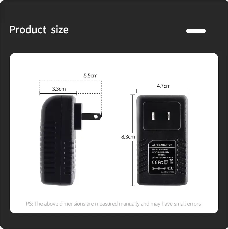 வெளியீடு: 48V DC 500mA - உங்கள் யூனிட்டிற்கு 500 MilliAmpsக்கு மேல் தேவைப்பட்டால் ஆர்டர் செய்ய வேண்டாம்