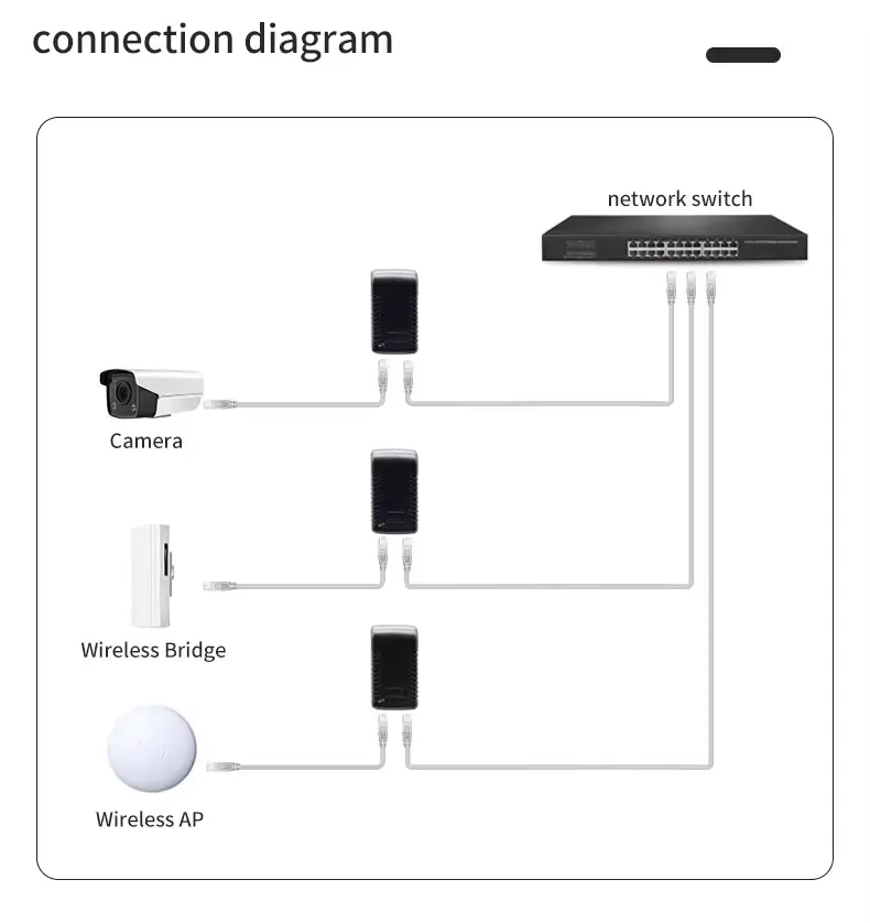 ஈத்தர்நெட் வழியாக 48V DC உள்ளீடு தேவைப்படும் நெட்வொர்க்கிங் சாதனங்களுக்காக இந்த இன்ஜெக்டர் வடிவமைக்கப்பட்டுள்ளது. இது தொழில்துறை-தரமான உபகரணங்களுடன் பரவலாக இணக்கமானது, உட்பட: