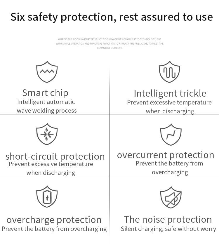 · உள்ளமைக்கப்பட்ட ஸ்மார்ட் சிப் மின்னழுத்தத்தையும் வெப்பநிலையையும் கண்காணிக்கிறது