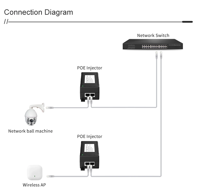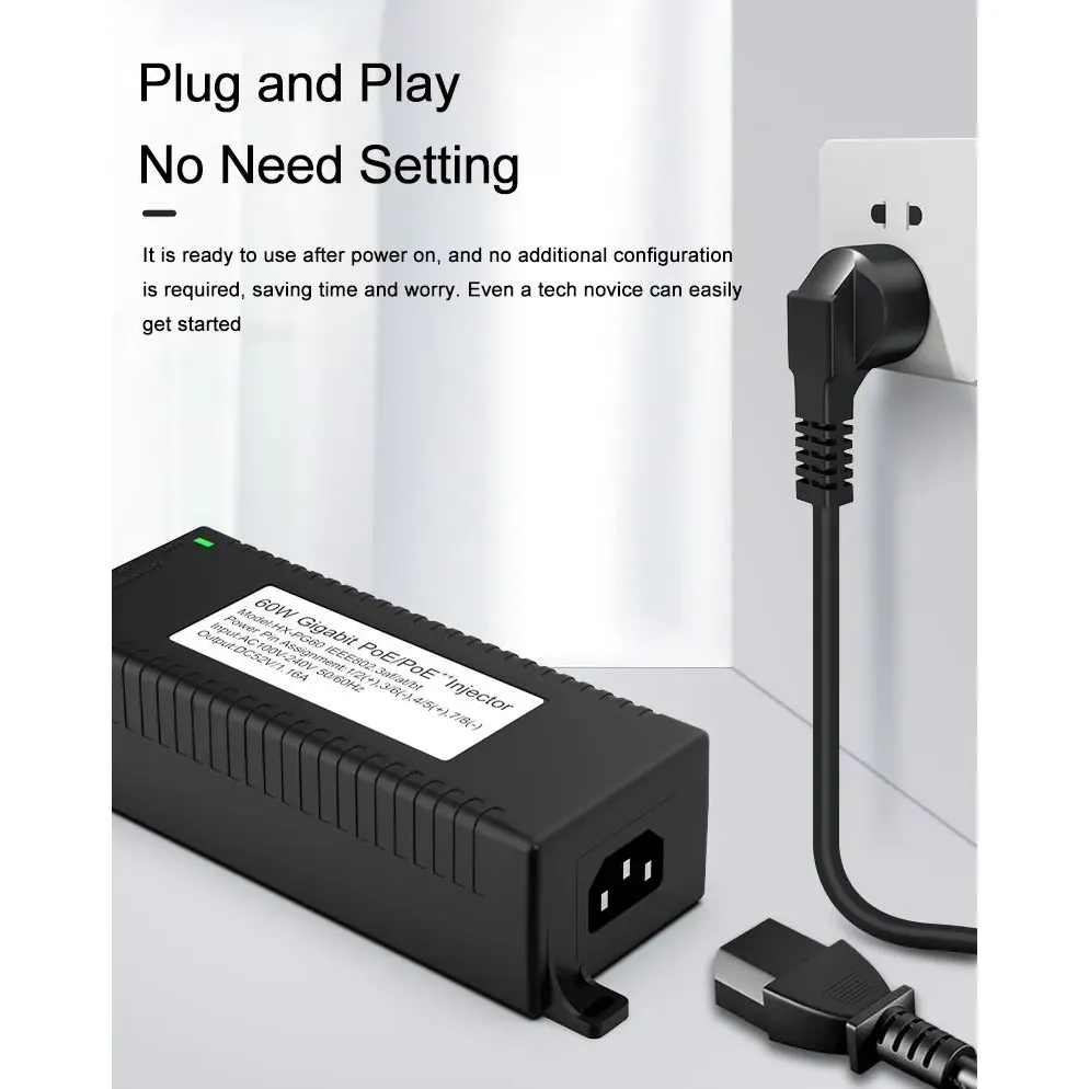 பாதுகாப்பு கண்காணிப்பு: IP கேமரா பாதுகாப்பு மற்றும் நெட்வொர்க் சாதனத்திற்கான கிகாபிட் 60W டெஸ்க்டாப் POE இன்ஜெக்டர் ஐபி கேமராக்கள் மற்றும் PTZ கேமராக்களுக்கு நிலையான சக்தியை வழங்குகிறது.