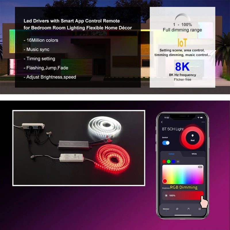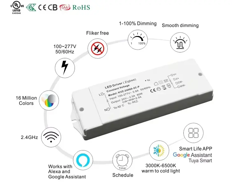 உங்கள் விரல் நுனியில் ஸ்மார்ட் டிம்மிங் TUYA தொழில்நுட்பத்துடன் ஒருங்கிணைந்த ZigBee வயர்லெஸ் மாட்யூலைக் கொண்டுள்ளது, இந்த இயக்கி தடையற்ற ஸ்மார்ட் கட்டுப்பாட்டை வழங்குகிறது. கூகுள் ஹோம் மற்றும் அமேசான் எக்கோ மூலம் மொபைல் பயன்பாடு அல்லது குரல் கட்டளைகள் மூலம் பிரகாசத்தை சரிசெய்யவும். உயர் அதிர்வெண் 8K ஹெர்ட்ஸ் PWM வெளியீடு முற்றிலும் ஃப்ளிக்கர் இல்லாத மங்கலை உறுதி செய்கிறது, அதே சமயம் 1% ஆழம் கொண்ட 1-100% மங்கலான வரம்பு மென்மையான மாற்றங்களுக்கும் சரியான சூழலை உருவாக்குவதற்கும் அனுமதிக்கிறது.