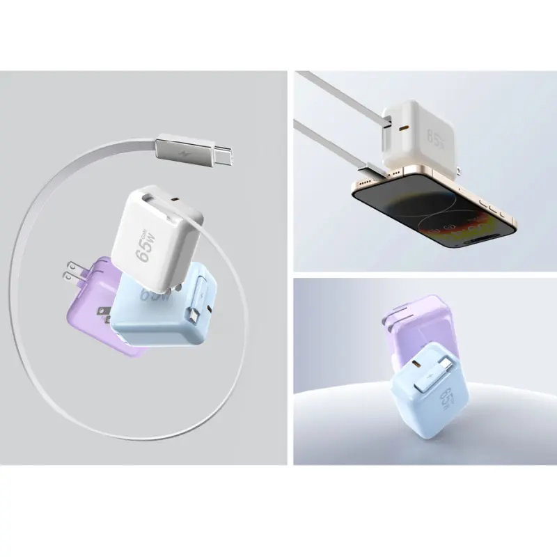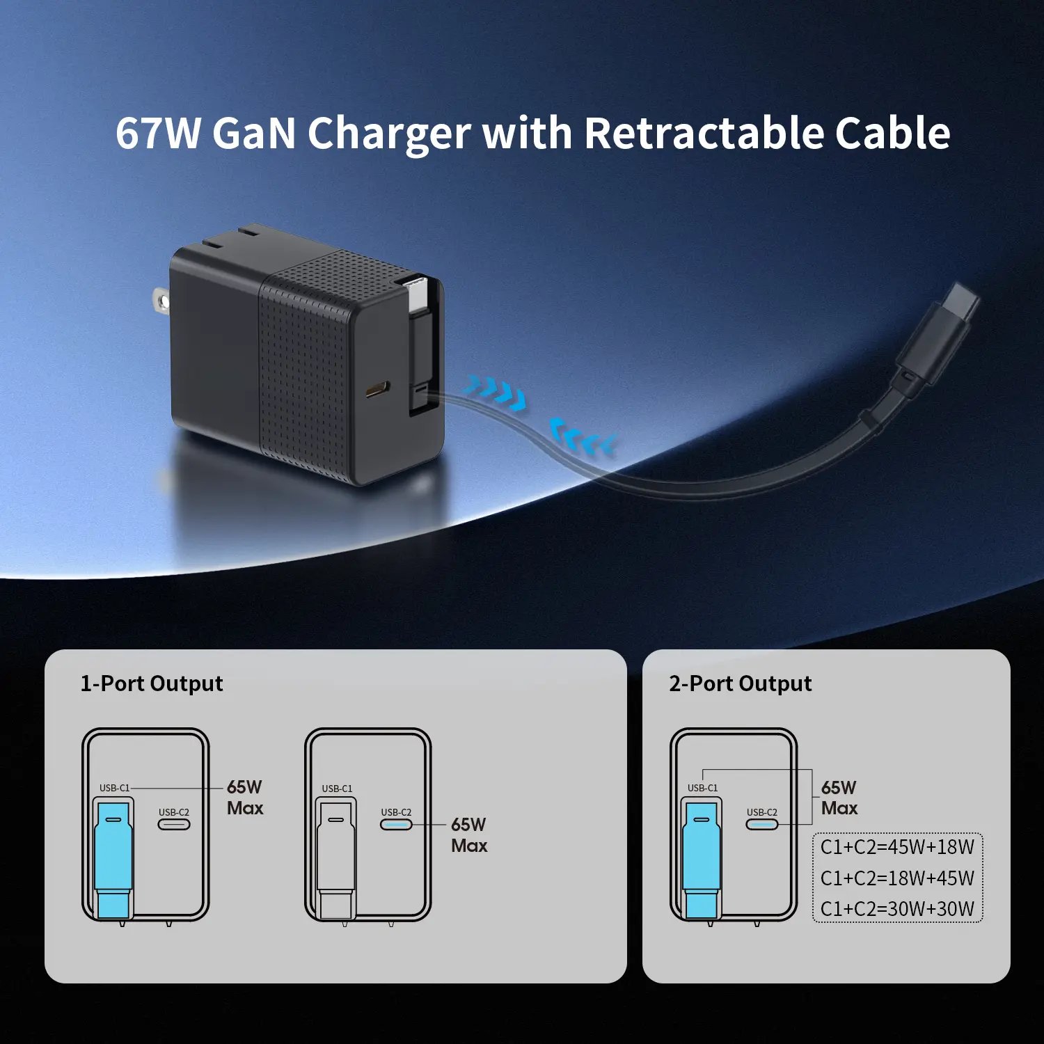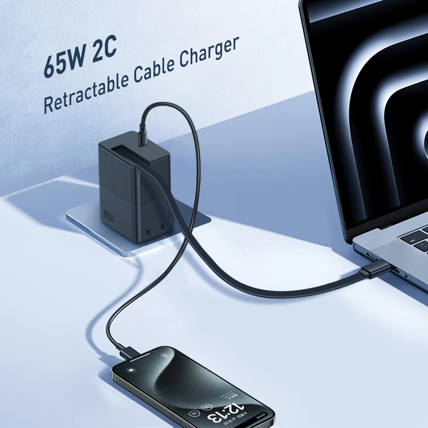 உள்ளிழுக்கக்கூடிய கேபிள்களுடன் பொருத்தப்பட்டுள்ளது: 65W ஃபாஸ்ட் சார்ஜிங் அடாப்டரில் வசதியான மற்றும் சிக்கலற்ற 2.3-அடி (1-மீட்டர்) நீளமுள்ள USB-C டேட்டா கேபிள் பொருத்தப்பட்டுள்ளது. இந்த கேபிள் சீராக நீட்டிக்க மற்றும் பின்வாங்க முடியும், இதனால் சிக்கலான கேபிள்களின் ஒழுங்கீனத்தைத் தவிர்க்கலாம் மற்றும் நீங்கள் எந்த நேரத்திலும் சார்ஜ் செய்யலாம் என்பதை உறுதிப்படுத்துகிறது.