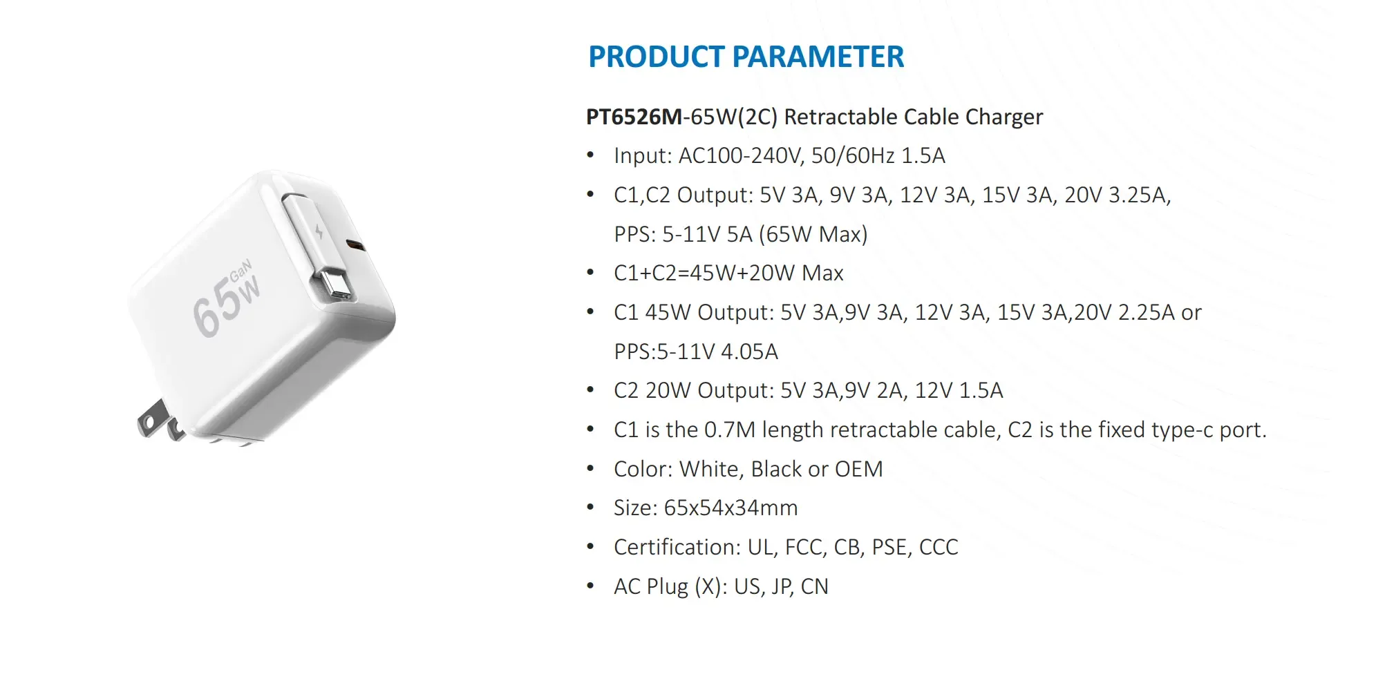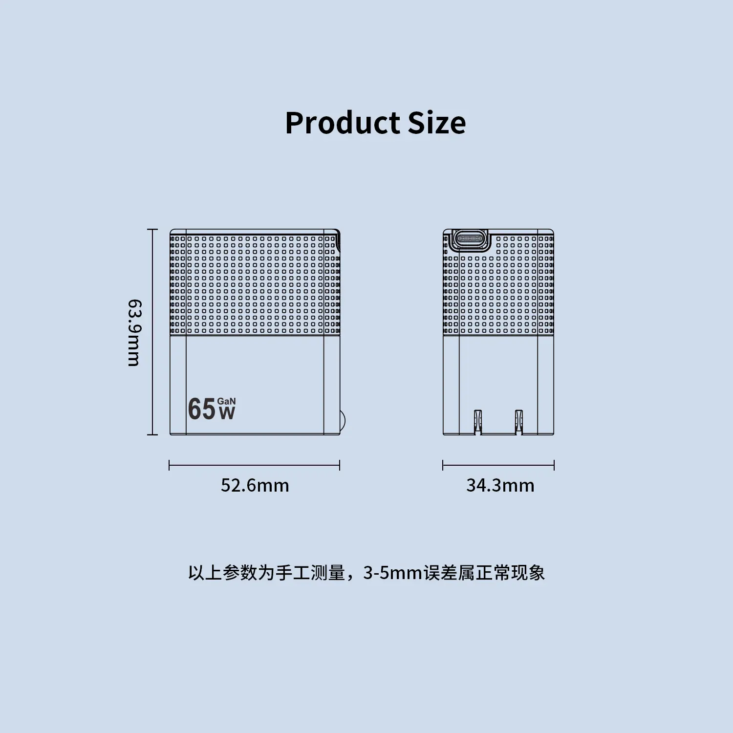 இரட்டை USB-C போர்ட்கள்: 65W PD 3.0 சார்ஜர் இரண்டு சாதனங்களை ஒரே நேரத்தில் சார்ஜ் செய்ய முடியும். இரண்டு சார்ஜிங் செயல்பாட்டின் போது, சக்தி 45W மற்றும் 20W என ஒதுக்கப்படுகிறது.
