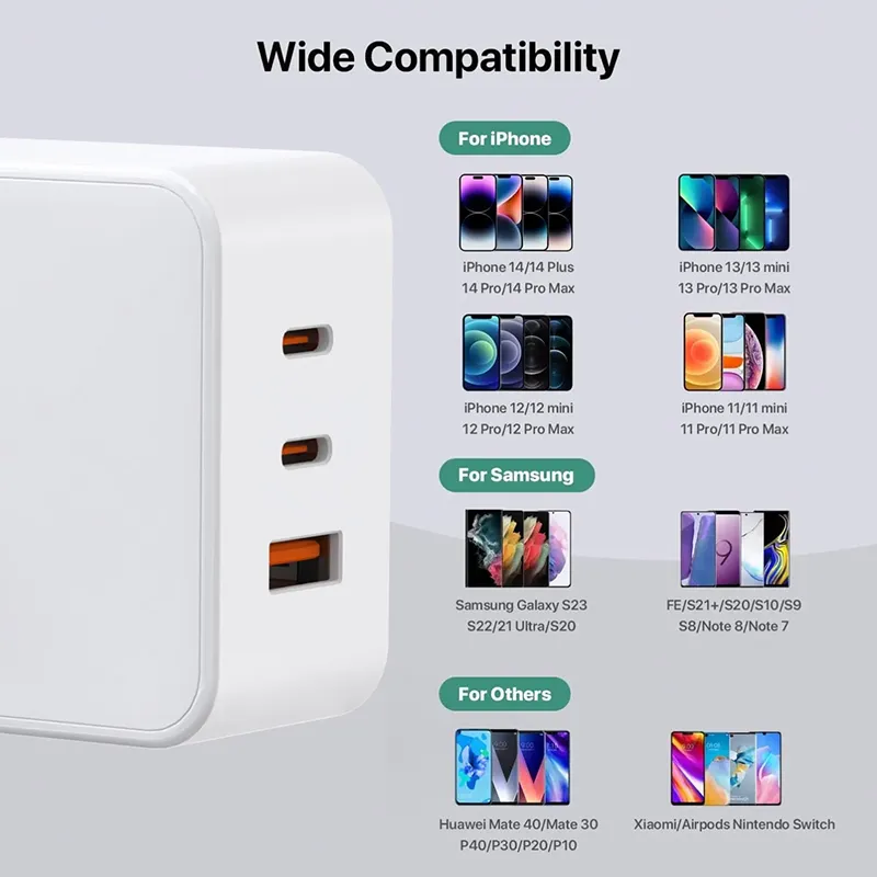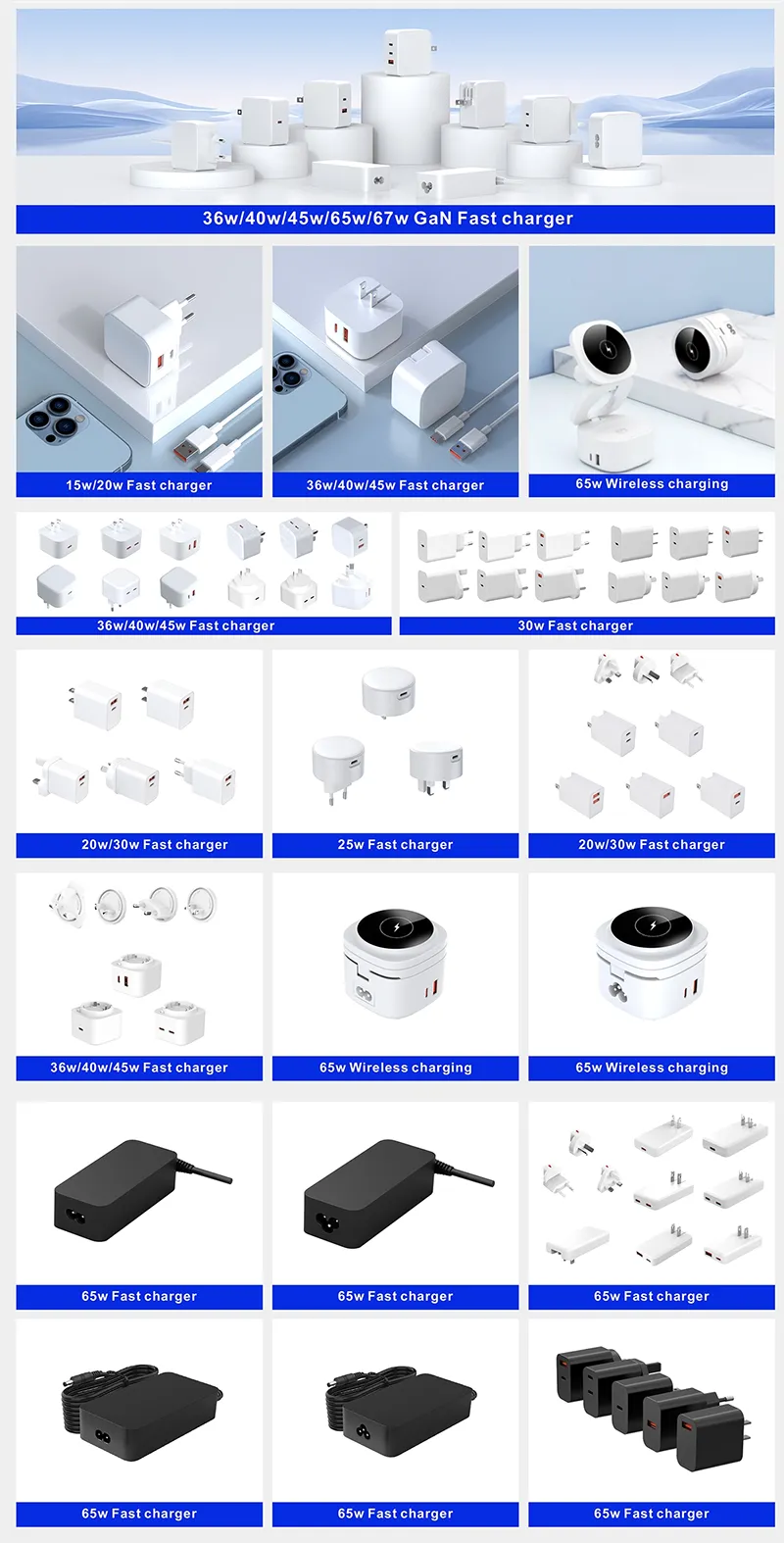 இந்த சார்ஜர் 65W வரை நிலையான ஆற்றலை வழங்குகிறது மற்றும் மடிக்கணினிகளை (எ.கா. MacBook Air/Pro, Dell XPS), டேப்லெட்டுகள், ஸ்மார்ட்போன்கள் (iPhone, Samsung Galaxy) மற்றும் PD நெறிமுறையை ஆதரிக்கும் பிற சாதனங்களை திறமையாக சார்ஜ் செய்கிறது. அதன் கச்சிதமான மற்றும் இலகுரக வடிவமைப்பு பயணத்திற்கு ஏற்றதாக அமைகிறது, அதே சமயம் உள்ளமைக்கப்பட்ட ஓவர்வோல்டேஜ், ஓவர் கரண்ட் மற்றும் ஷார்ட் சர்க்யூட் பாதுகாப்பு சார்ஜர் மற்றும் இணைக்கப்பட்ட சாதனங்களின் பாதுகாப்பான சார்ஜிங்கை உறுதி செய்கிறது. இது வழக்கமாக 1-2 USB-C இடைமுகங்களுடன் பொருத்தப்பட்டுள்ளது, இது ஒரே நேரத்தில் பல சிறிய சாதனங்களை சார்ஜ் செய்வதையும், சக்தி மற்றும் வசதியையும் சமநிலைப்படுத்துவதை ஆதரிக்கிறது.