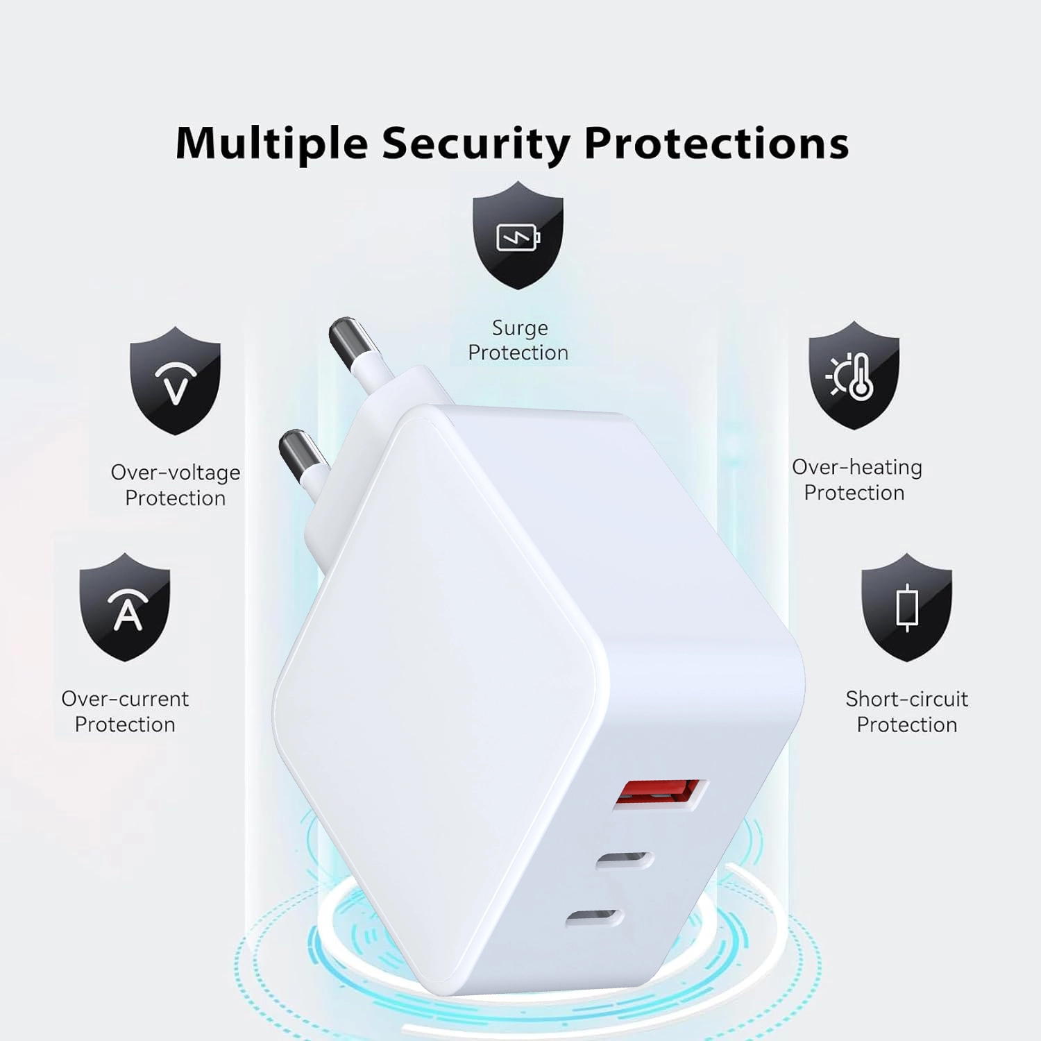 லேப்டாப் 2A வெளியீடுக்கான 65W PD 3.0 அல்ட்ரா-தின் 3 போர்ட் UK GaN சார்ஜர் ஃபாஸ்ட் சார்ஜர் OTP |