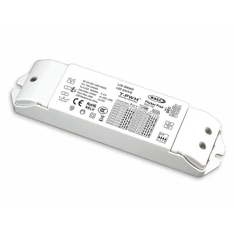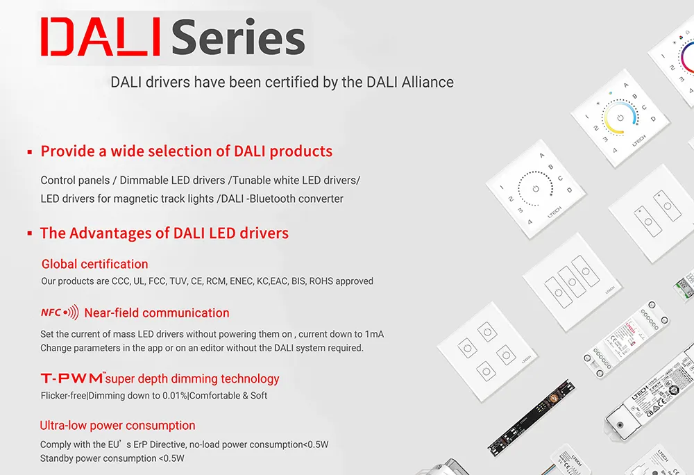 மேம்பட்ட DALI மங்கலான கட்டுப்பாடு - உயர் தெளிவுத்திறனுடன் 0.1% முதல் 100% வரை டிஜிட்டல் மங்கலைச் செயல்படுத்துகிறது, தானியங்கு விளக்கு அமைப்புகளில் தனிநபர் அல்லது குழுக் கட்டுப்பாட்டிற்கு 64 DALI முகவரிகளை ஆதரிக்கிறது.
