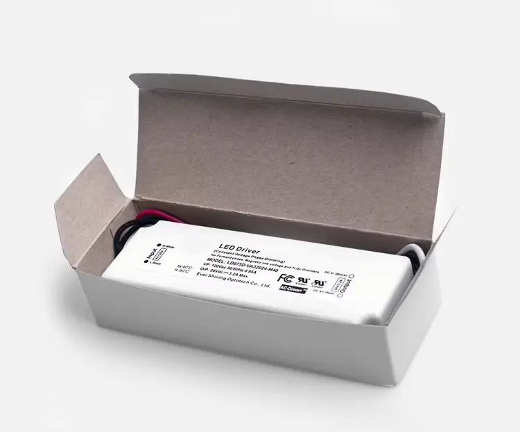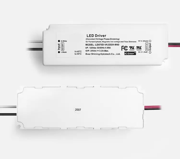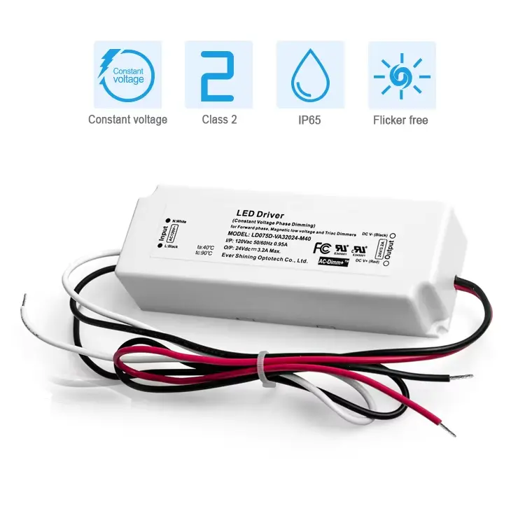 75W கான்ஸ்டன்ட் வோல்டேஜ் எல்இடி டிரைவர், டிஆர்ஐஏசி டிம்மிங் • இணக்கத்தன்மை: மிகவும் நிலையான TRIAC/இன்கேண்டசென்ட்-ஸ்டைல் டிம்மர்களுடன் வேலை செய்கிறது. • நிலையான வெளியீடு: 12V அல்லது 24V LED அமைப்புகளுக்கான நிலையான மின்னழுத்தம் (CV). • ஸ்மூத் கன்ட்ரோல்: ஃபுல்-ரேஞ்ச், ஃப்ளிக்கர்-ஃப்ரீ டிம்மிங்கை இயக்குகிறது. • வலுவான பாதுகாப்பு: மின் கோளாறுகளுக்கு எதிராக உள்ளமைக்கப்பட்ட பாதுகாப்புகள். • வழக்கமான பயன்பாடு: மங்கக்கூடிய LED கீற்றுகள், தொகுதிகள் மற்றும் டிராக் விளக்குகளுக்கு ஏற்றது.