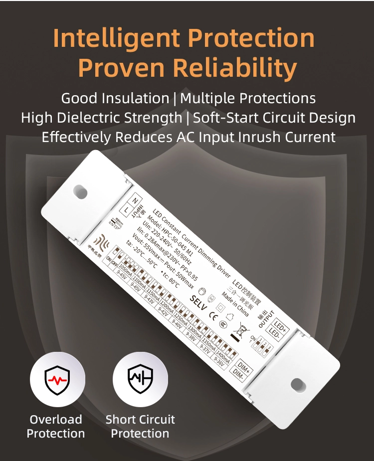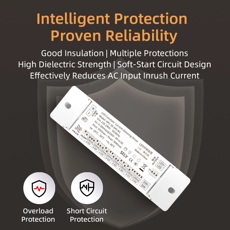 பல பாதுகாப்பு வடிவமைப்பு: நான்கு பாதுகாப்பு வழிமுறைகளுடன் கட்டப்பட்டது: அதிக மின்னழுத்தம் (பாதுகாப்பு வரம்பு ≥55V), அதிக மின்னோட்டம் (பாதுகாப்பு வாசல் ≥0.18A), ஷார்ட் சர்க்யூட் மற்றும் அதிக வெப்பம் (பாதுகாப்பு வெப்பநிலை ≥110℃). இயக்கி மற்றும் எல்இடி ஒளி மூலங்களை சேதத்திலிருந்து பாதுகாக்க அசாதாரண வேலை நிலைமைகளின் போது இது வெளியீட்டை விரைவாக துண்டித்துவிடும்.