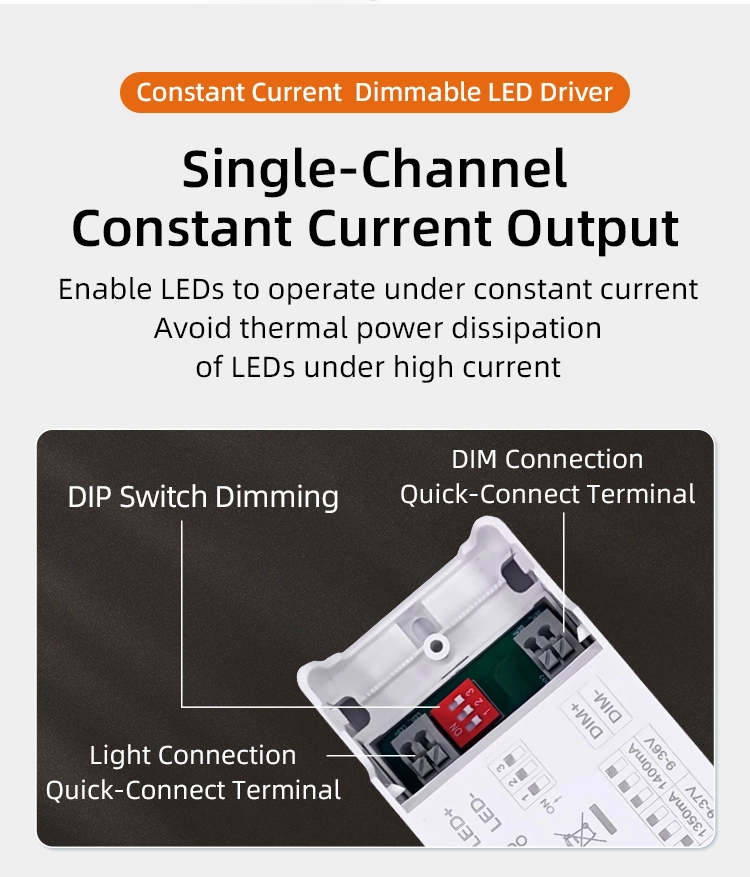 இரட்டை மங்கலான முறைகள்: நிலையான தற்போதைய டிம்மிங் LED இயக்கி 0-10V/1-10V இரட்டை மங்கலான சமிக்ஞை உள்ளீட்டை ஆதரிக்கிறது. மங்கலான வரம்பு 0-100%, மங்கலான நேரியல் ≥95%. இது எந்த மங்கலான நடுக்கமும் அல்லது பின்னடைவும் இல்லாமல் மங்கலிலிருந்து முழு பிரகாசத்திற்கு தடையற்ற மற்றும் மென்மையான மாற்றத்தை அடைய முடியும். இது பல்வேறு அறிவார்ந்த மங்கலான அமைப்புகளுடன் இணக்கமானது மற்றும் வெவ்வேறு காட்சிகளின் லைட்டிங் தேவைகளைப் பூர்த்தி செய்ய முடியும்.