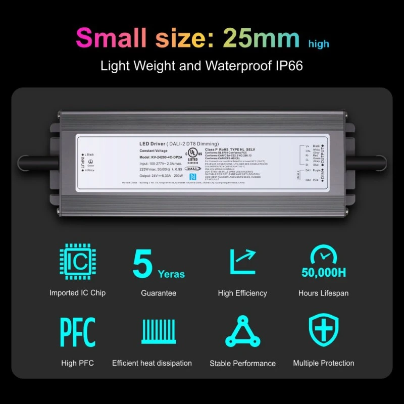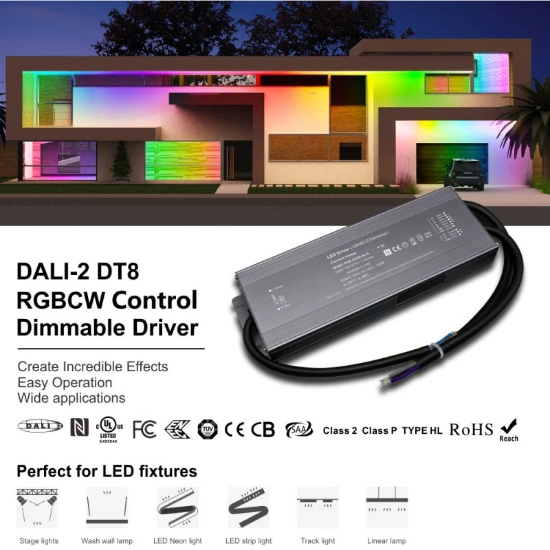 இந்த தயாரிப்பு ஒரு DALI கான்ஸ்டன்ட் வோல்டேஜ் 200W CCT டிம்மபிள் எல்இடி டிரைவர், உயர்தர வணிக மற்றும் ஸ்மார்ட் ஹோம் லைட்டிங் கட்டுப்பாட்டிற்கான மேம்பட்ட தீர்வைக் குறிக்கிறது. DALI 2 DT8 Dimmable 200W LED டிரைவர் தரநிலையுடன் முழுமையாக இணங்கக்கூடிய ஒரு முக்கிய அங்கமாக, இது மென்மையான மற்றும் படியற்ற பிரகாசத்தை சரிசெய்வது மட்டுமல்லாமல், DT8 நீட்டிக்கப்பட்ட நெறிமுறை மூலம், வண்ண வெப்பநிலை (CCT) மற்றும் வண்ண (RGB) ஒளியின் துல்லியமான மற்றும் டிஜிட்டல் நிர்வாகத்தை வழங்குகிறது, வடிவமைப்பாளர்களுக்கு முன்னோடியில்லாத ஒளி மற்றும் ஷாவ்னாமிக் திறன் உருவாக்கம் ஆகியவற்றை வழங்குகிறது.