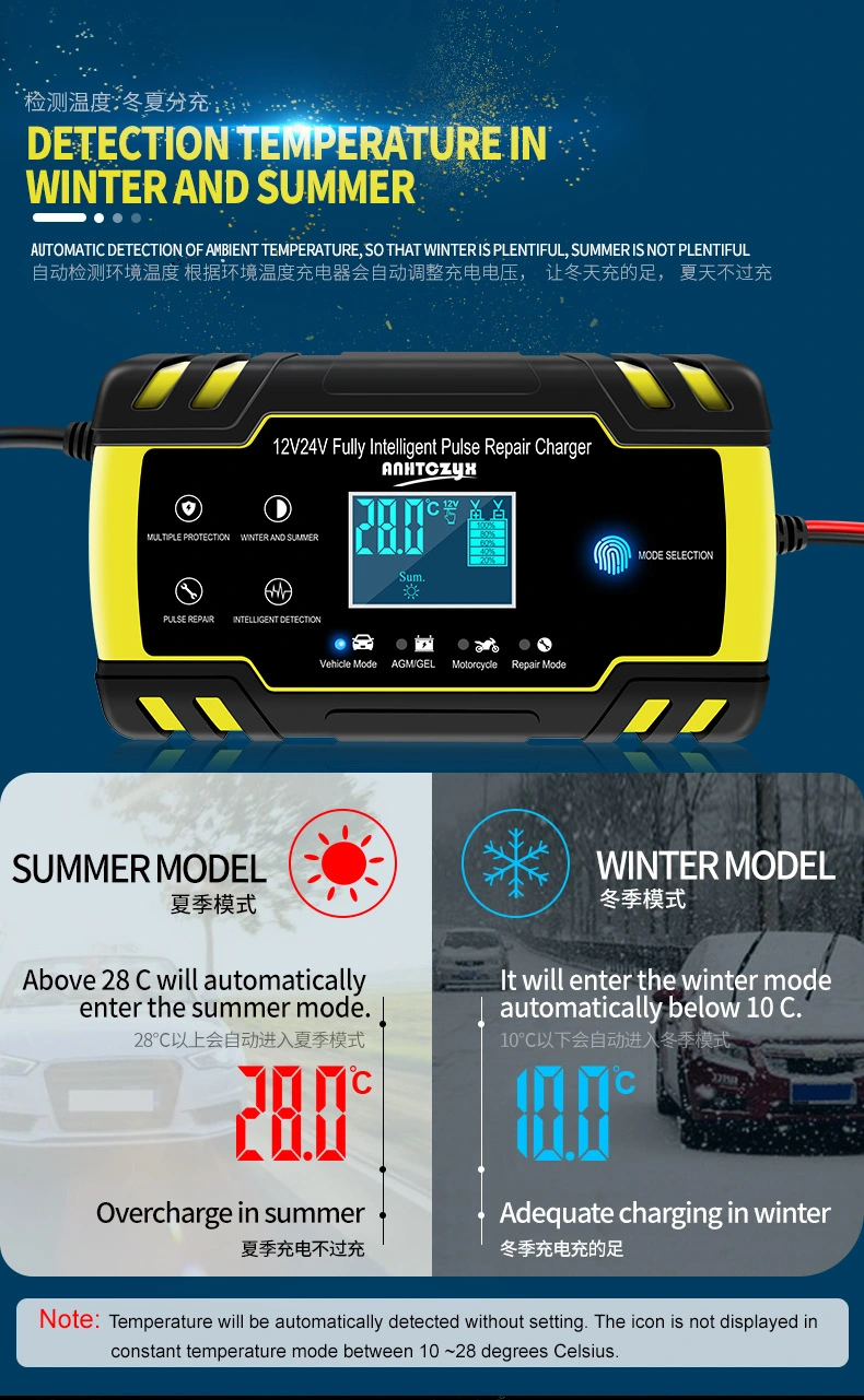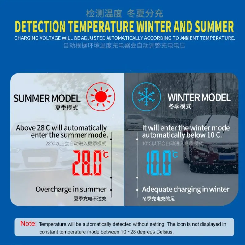 · தானியங்கு பராமரிப்பு முறை: டிரிக்கிள் சார்ஜர் மற்றும் நீண்ட கால பேட்டரி பராமரிப்பாளராக செயல்படுகிறது, பருவகால அல்லது அடிக்கடி பயன்படுத்தப்படும் வாகனங்களுக்கு ஏற்றது.