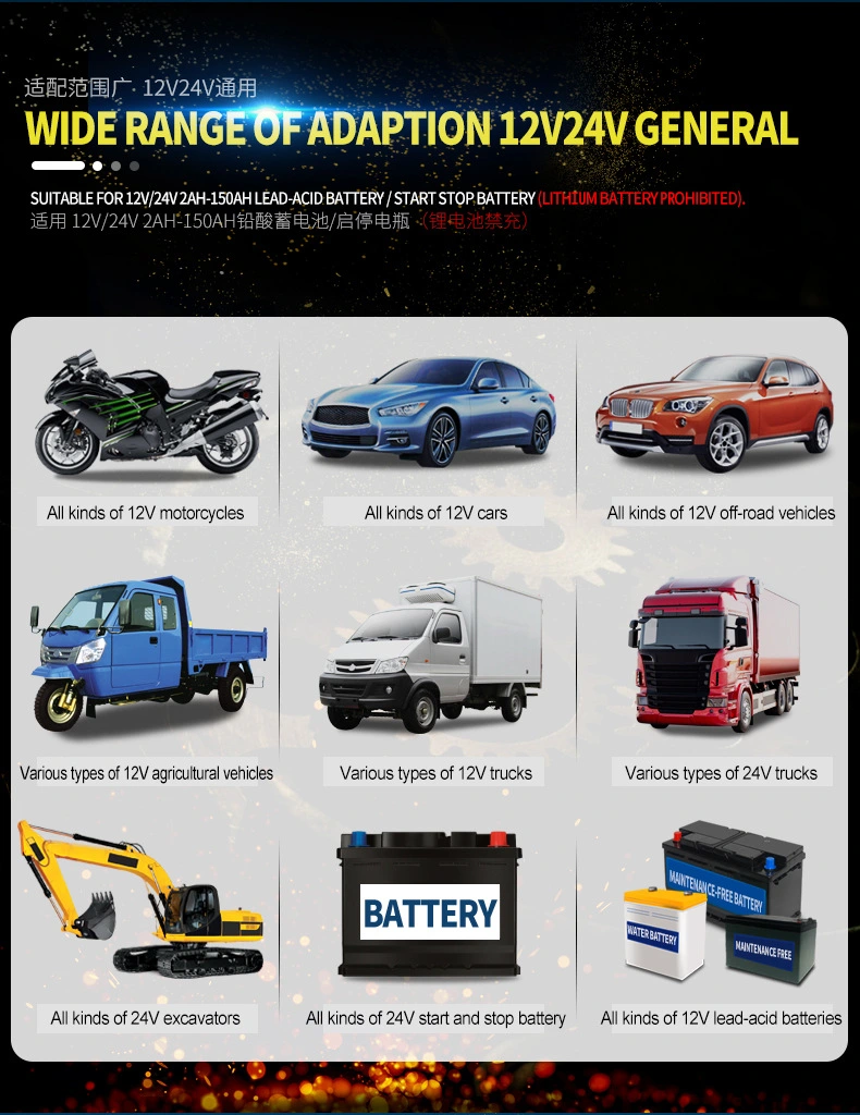 · இரட்டை மின்னழுத்த வெளியீடு: 12V 8A மற்றும் 24V 4A ஆகியவற்றை ஆதரிக்கிறது, இது கார்கள், SUVகள், மோட்டார் சைக்கிள்கள், டிரக்குகள் மற்றும் படகுகள் உள்ளிட்ட பல்வேறு வகையான வாகனங்களுடன் இணக்கமாக உள்ளது.