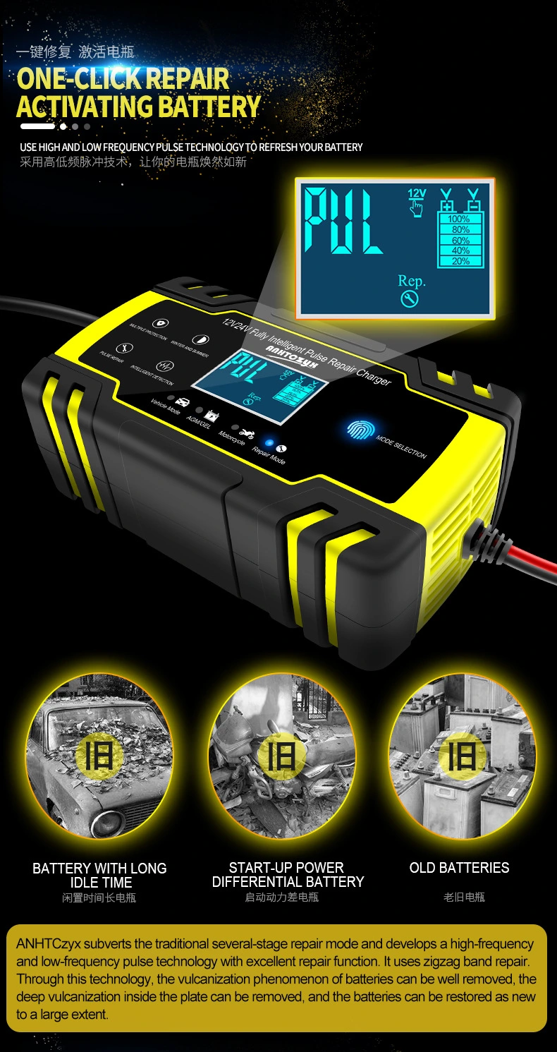 · பல்ஸ் பழுதுபார்க்கும் செயல்பாடு: லீட் சல்பேட் படிகமயமாக்கலை (சல்ஃபேஷன்) குறைக்க உயர் அதிர்வெண் துடிப்பு தொழில்நுட்பத்தைப் பயன்படுத்துகிறது, இது வயதான அல்லது குறைந்த சார்ஜ் செய்யப்பட்ட பேட்டரிகளில் இழந்த திறனை மீட்டெடுக்க உதவுகிறது.