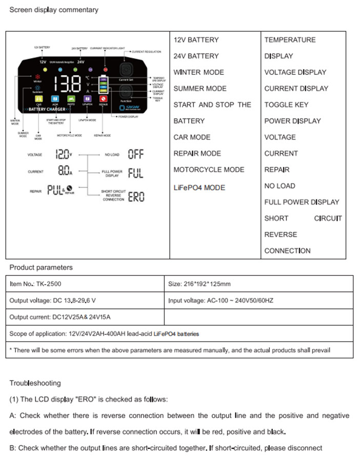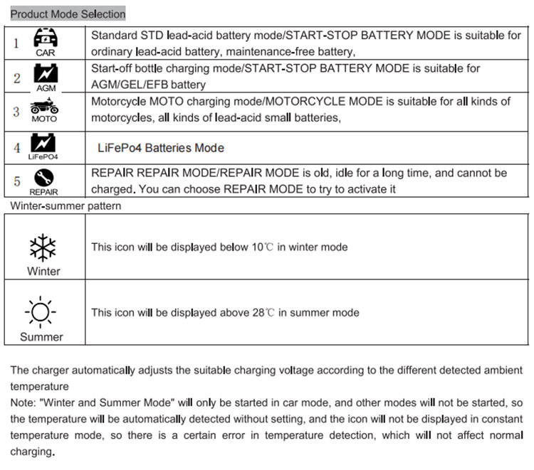 பரந்த பேட்டரி வகை ஆதரவு: ஸ்டாண்டர்ட் ஃப்ளடட் (ஈரமான), ஏஜிஎம் (உறிஞ்சும் கண்ணாடி மேட்), ஜெல் மற்றும் கால்சியம் பேட்டரிகள் உட்பட பல்வேறு பேட்டரி கெமிஸ்ட்ரிகளுடன் இணக்கமானது, ஒவ்வொரு குறிப்பிட்ட வகைக்கும் உகந்த சார்ஜிங்கை உறுதி செய்கிறது.