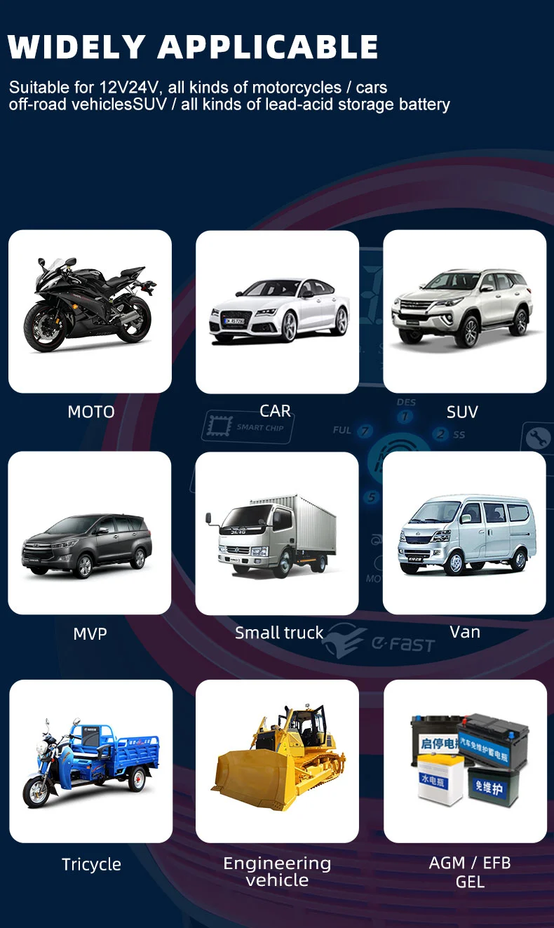 TK-1500 ஒரு சக்திவாய்ந்த முழு தானியங்கி பேட்டரி சார்ஜர் ஆகும், இது இரண்டு சார்ஜிங் முறைகளை வழங்குகிறது: 12V/20A மற்றும் 24V/10A. இது குறிப்பாக ஆட்டோமொபைல்கள், டிரக்குகள், மோட்டார் சைக்கிள்கள், படகுகள், புல்வெளி அறுக்கும் இயந்திரங்கள், SUVகள், RVகள், டிராக்டர்கள் மற்றும் அனைத்து வகையான ஸ்கூட்டர்களுக்காகவும் வடிவமைக்கப்பட்டுள்ளது. பாரம்பரிய லெட்-அமில பேட்டரிகள் (வெள்ளம், ஏஜிஎம், ஜெல், ஆழமான சுழற்சி, கால்சியம் பேட்டரிகள்) அல்லது மேம்பட்ட லித்தியம் இரும்பு பாஸ்பேட் (LiFePO4) மற்றும் லித்தியம்-அயன் பேட்டரிகள் எதுவாக இருந்தாலும், TK-1500 ஆனது சிறந்த சார்ஜிங் வளைவை புத்திசாலித்தனமாக அடையாளம் கண்டு பொருத்த முடியும், உண்மையிலேயே ஒரு சாதனத்தில் பலநோக்கு செயல்பாட்டை அடையும்.