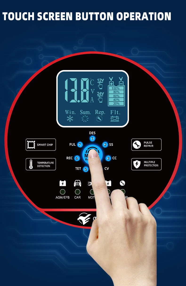 இந்த சார்ஜர் ஒரு புதுமையான கச்சிதமான வடிவமைப்பைக் கொண்டுள்ளது மற்றும் மின்னழுத்தம், மின்னோட்டம், வெப்பநிலை, சார்ஜிங் முன்னேற்றம் மற்றும் பேட்டரி நிலையை நிகழ்நேரத்தில் காட்டும் உயர்-வரையறை LCD டிஸ்ப்ளே பொருத்தப்பட்டுள்ளது, இது ஒரு பார்வையில் செயல்பாட்டை தெளிவாக்குகிறது. இது ஒரு உள்ளமைக்கப்பட்ட துடிப்பு பழுதுபார்க்கும் செயல்பாட்டைக் கொண்டுள்ளது, இது பழைய பேட்டரிகளை செயல்படுத்தி சரிசெய்து, அவற்றின் ஆயுட்காலத்தை நீட்டிக்கும். முழு தானியங்கு நுண்ணறிவு சார்ஜராக, TK-1500 ஆனது "பிளக் அண்ட் மறதி" செயல்பாட்டை ஆதரிக்கிறது: இது தானாகவே பேட்டரி மின்னழுத்தத்தைக் கண்டறிந்து, சார்ஜிங் பயன்முறையைத் தேர்ந்தெடுத்து, அதிக சார்ஜ் செய்வதைத் தடுக்க முழு சார்ஜிங்கிற்குப் பிறகு மிதவை சார்ஜிங் பராமரிப்பு முறைக்கு மாறுகிறது. நீண்ட நேரம் நிறுத்தப்படும் வாகனங்கள் அல்லது புல்வெளி அறுக்கும் இயந்திரம் மற்றும் படகுகள் போன்ற பருவகால உபகரணங்களின் பேட்டரி பராமரிப்புக்கு இது சிறந்தது.