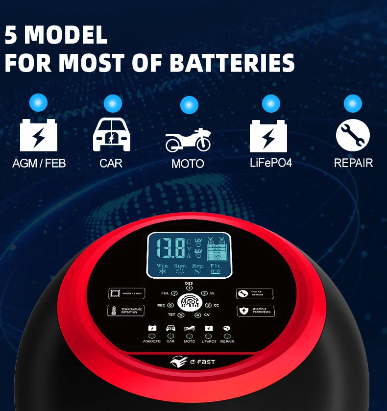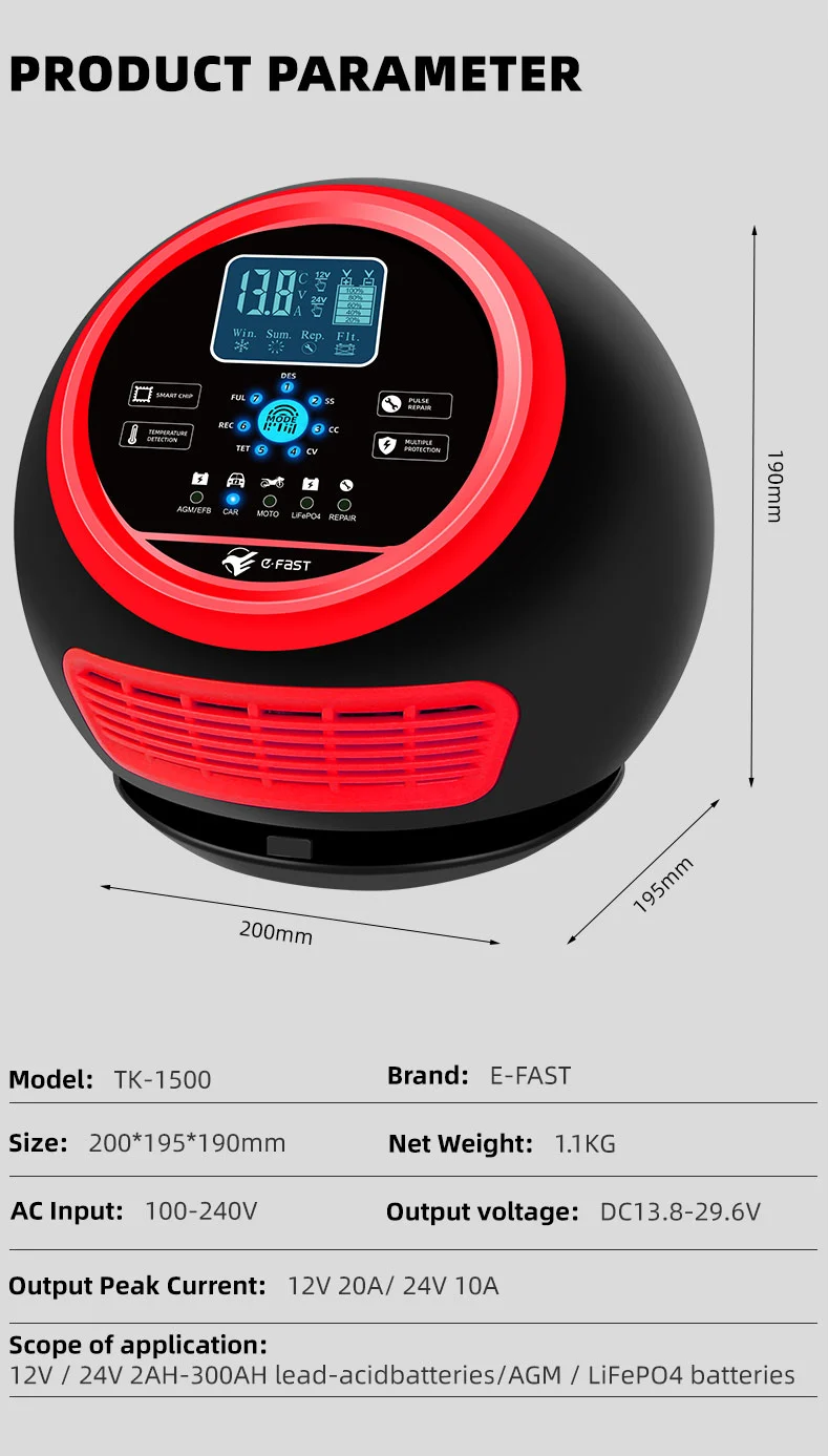 TK-1500 LCD டிஸ்ப்ளே கார் மோட்டார் சைக்கிள் டிரக் தானியங்கி பேட்டரி சார்ஜர் 12V20A 24V10A லீட் ஆசிட் lifepo4 பேட்டரி சார்ஜர் |
