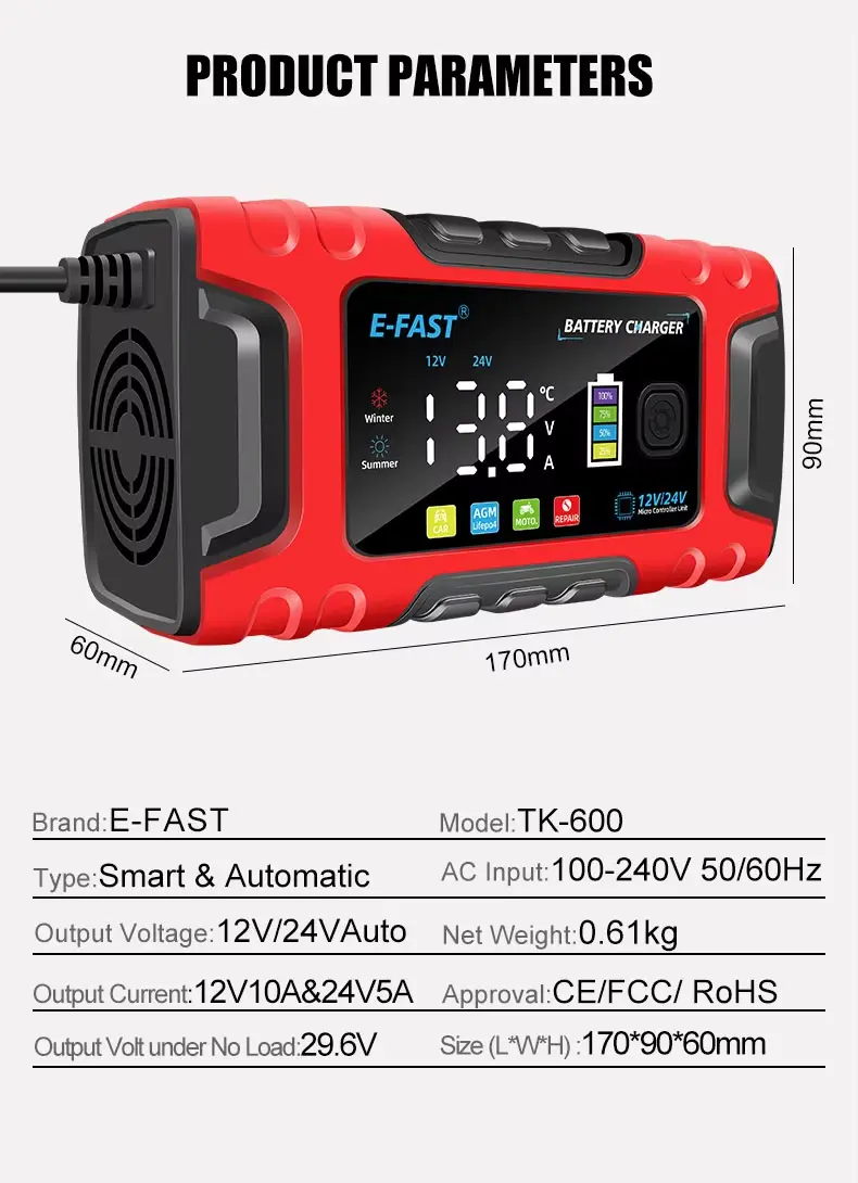 பல்ஸ் ரிப்பேர் டெக்னாலஜி 12V10A 24V5A லீட் ஆசிட் லைஃப்போ4 பேட்டரி சார்ஜருடன் கூடிய உயர்தர E-Fast TK-600 காருக்கான முழு தானியங்கி |