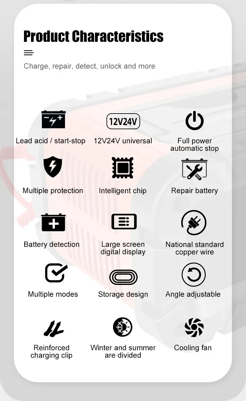 TK700 யுனிவர்சல் 12V 24V லீட் ஆசிட் பேட்டரி சார்ஜர் பேட்டரி மின்னழுத்தத்தை (12V/24V) தானாகக் கண்டறிந்து, பொருந்தாத அல்லது சேதமடையாமல் சரியான சார்ஜிங்கை உறுதிசெய்கிறது.
