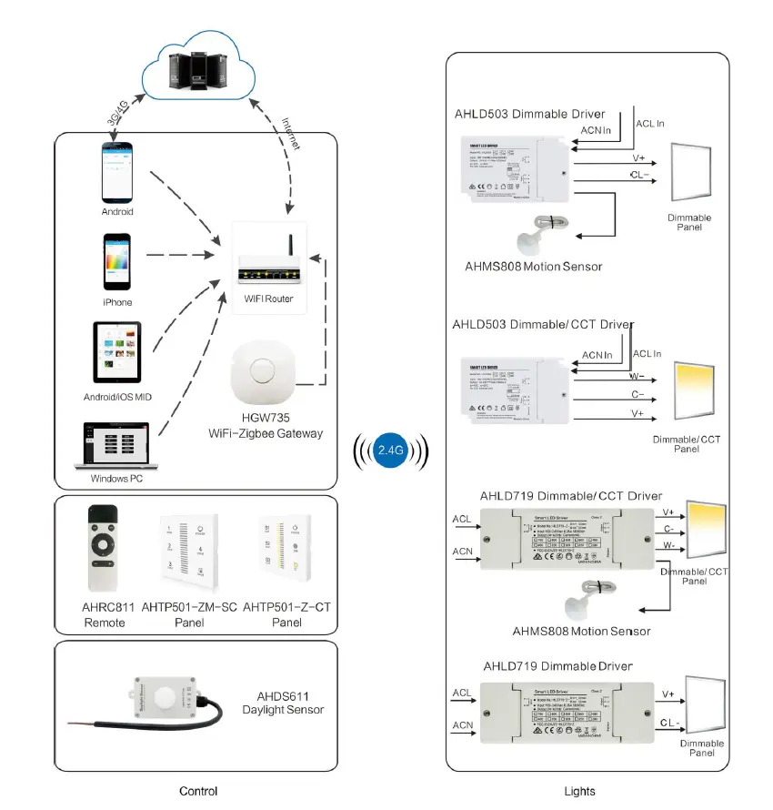 * ஜிக்பீ வயர்லெஸ் கட்டுப்பாடு: ஸ்மார்ட்போன், டேப்லெட், பிசி, சுவர் சுவிட்ச், ரிமோட் கண்ட்ரோல்